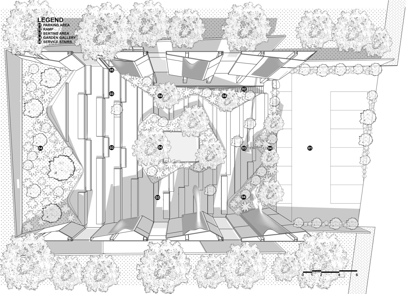 The design was to demonstrate a selfless approach to creating many sheltered indoor spaces hidden within a simple multi-leveled garden. Spaces that were created became a sequential space and were not an initial space.