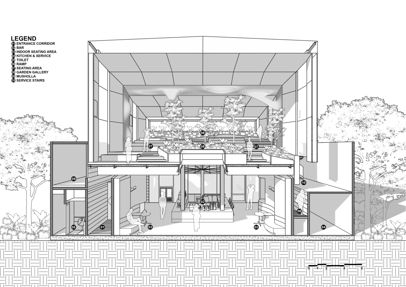 An oasis-like rainbow skylight in the middle of the garden lets the sunset rays penetrate right into the middle of the indoor café. Creating many causal contrast spaces that are produced from optimizing negative section spaces.