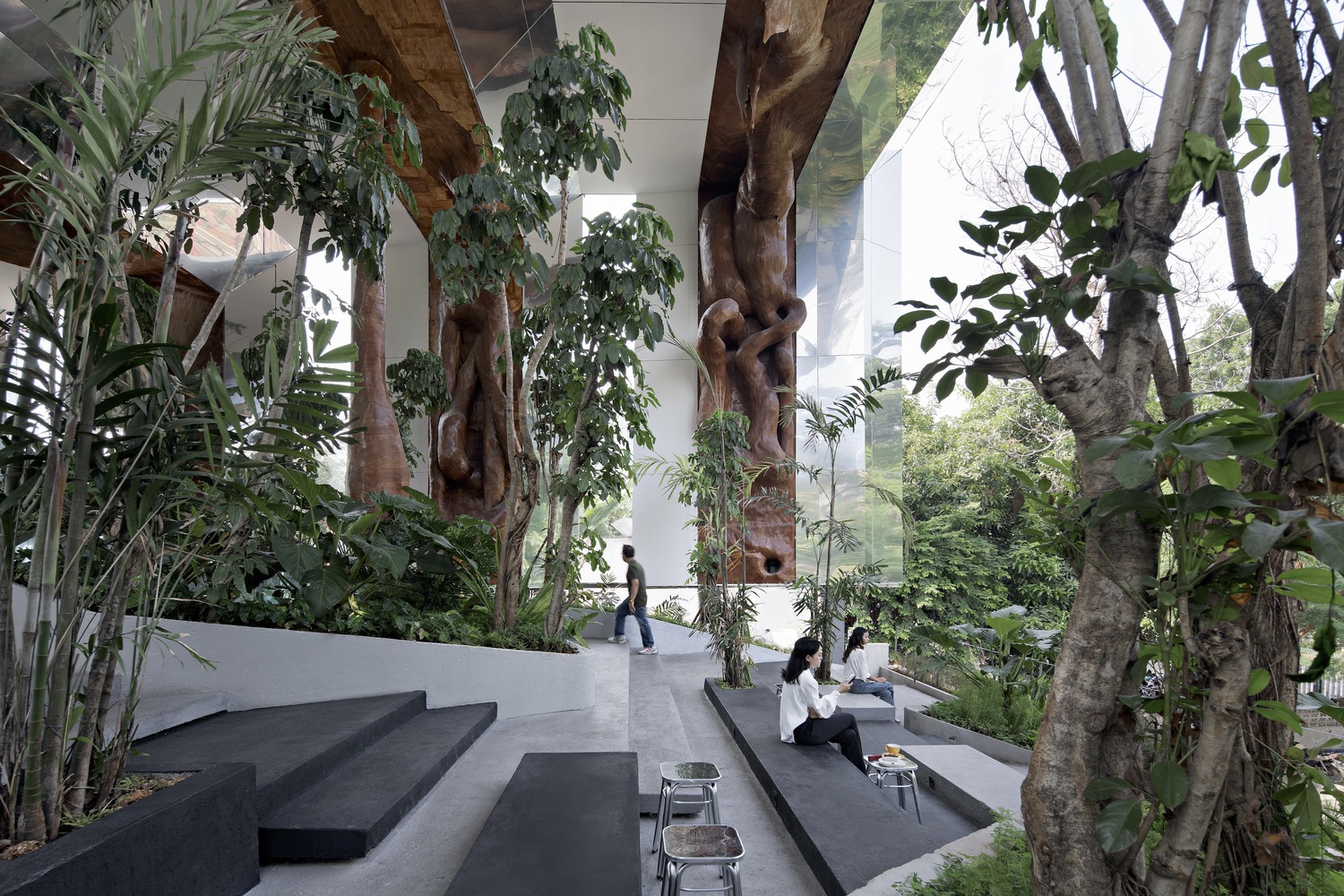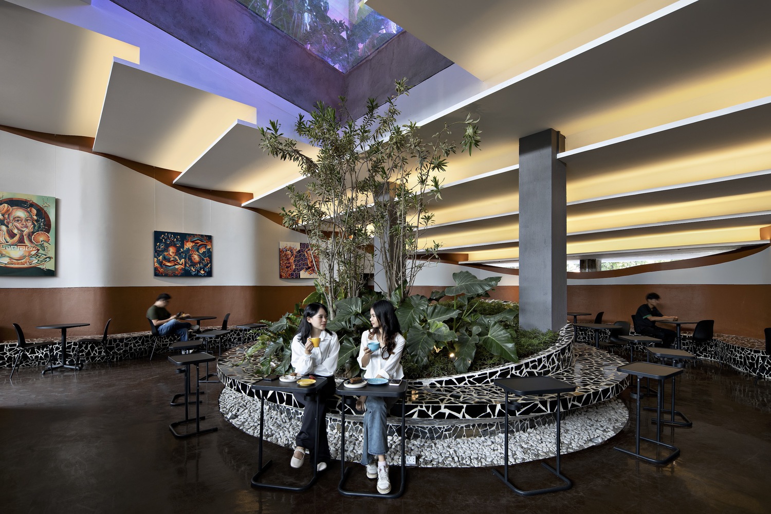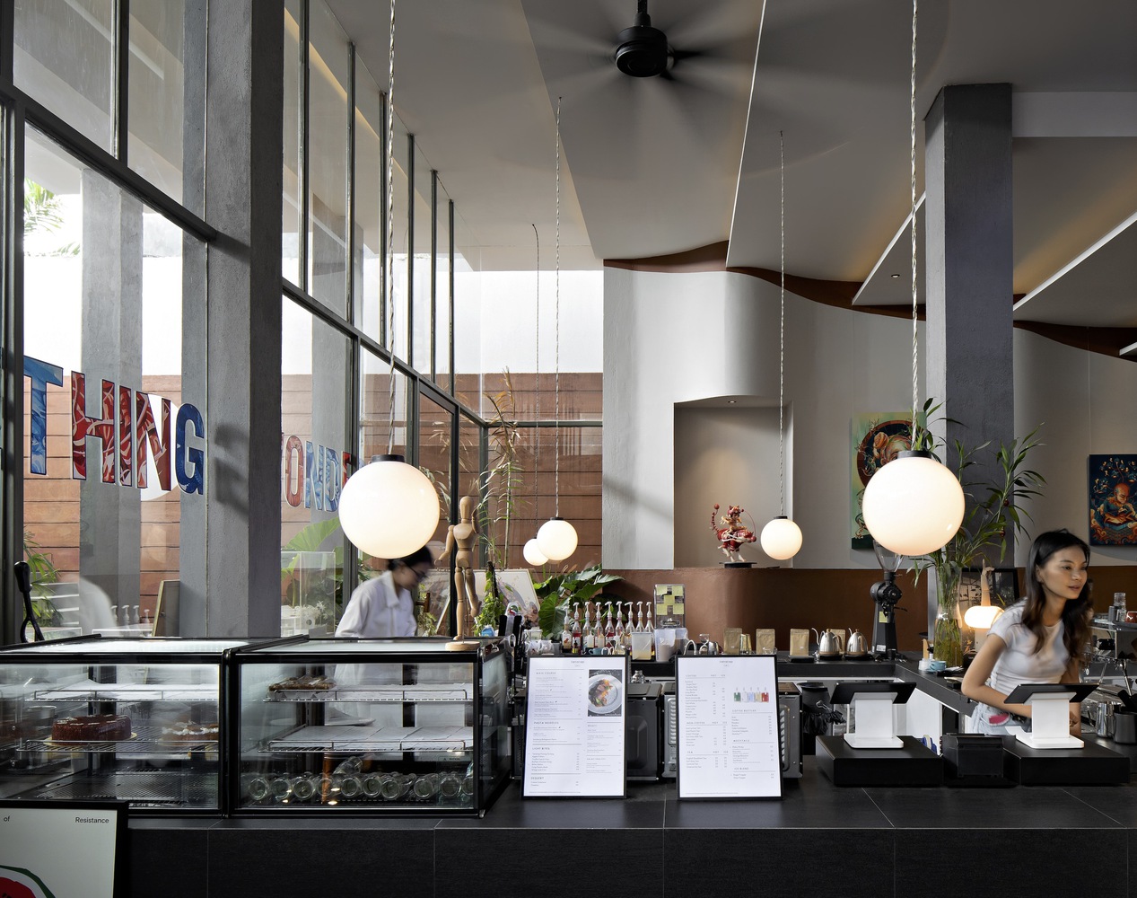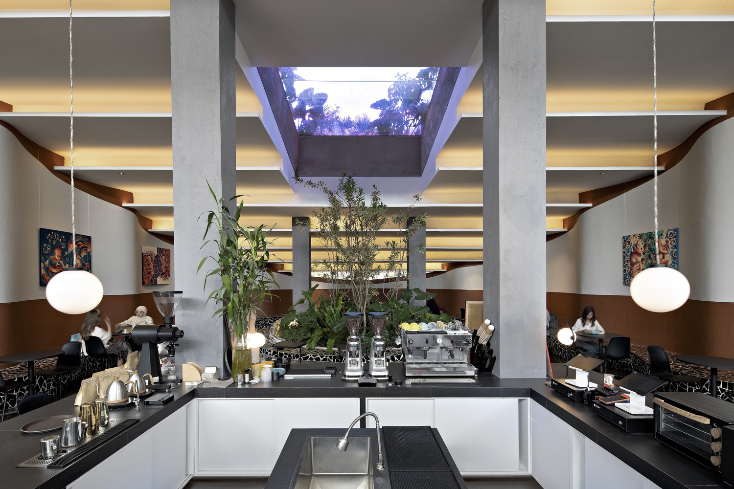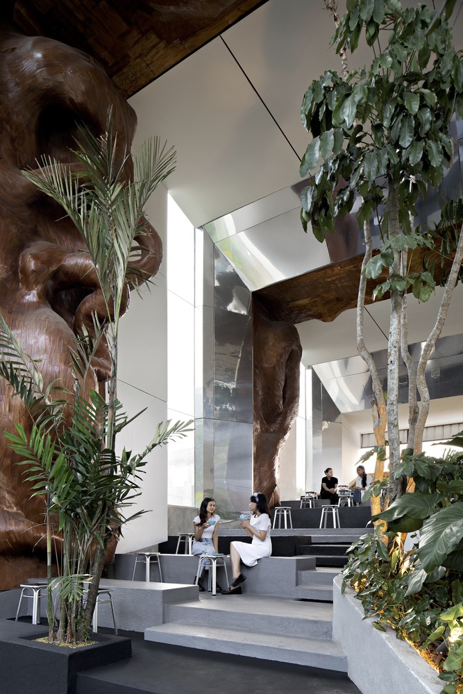it invites for a unique experience for visitors to enjoy semi-outdoor & indoor art gallery blends with man-made jungle. The open layout creates an efficient interior unit flow and interaction of the bar area, communal table, and circulations.