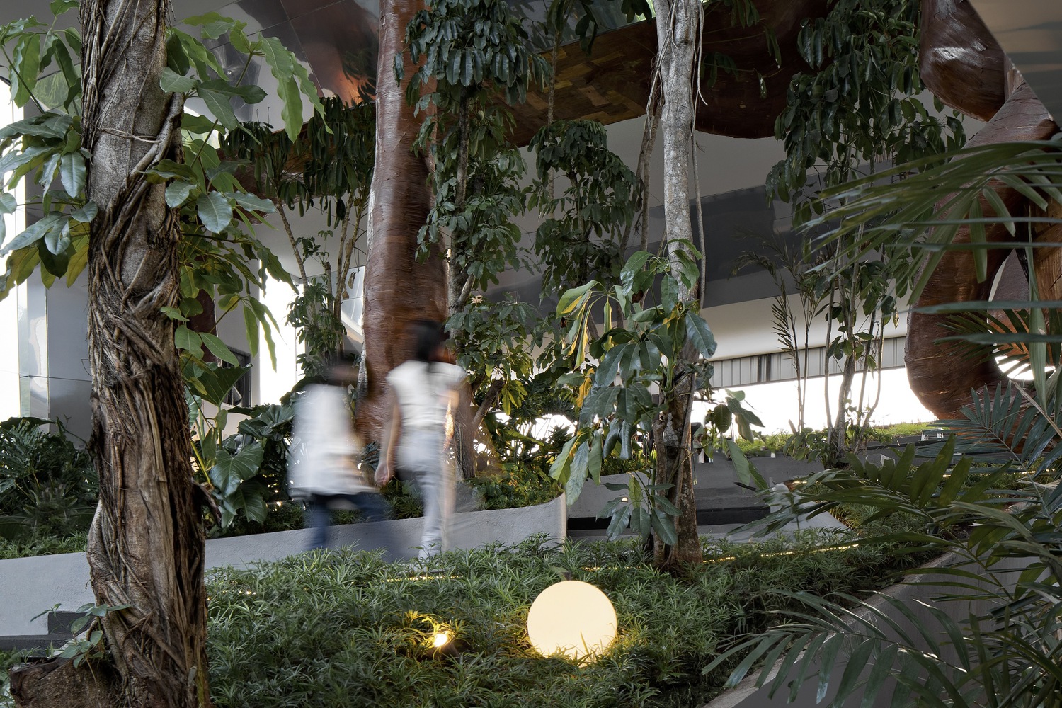 Weaving yet symmetrical indoor spaces open up a big intro of similar tunnel experiences connecting to 9 m height sheltered public gardens that slowly change perspective as visitors walk upwards deep inside the garden.