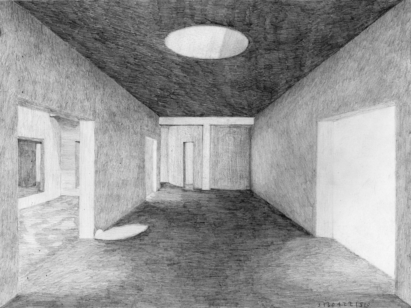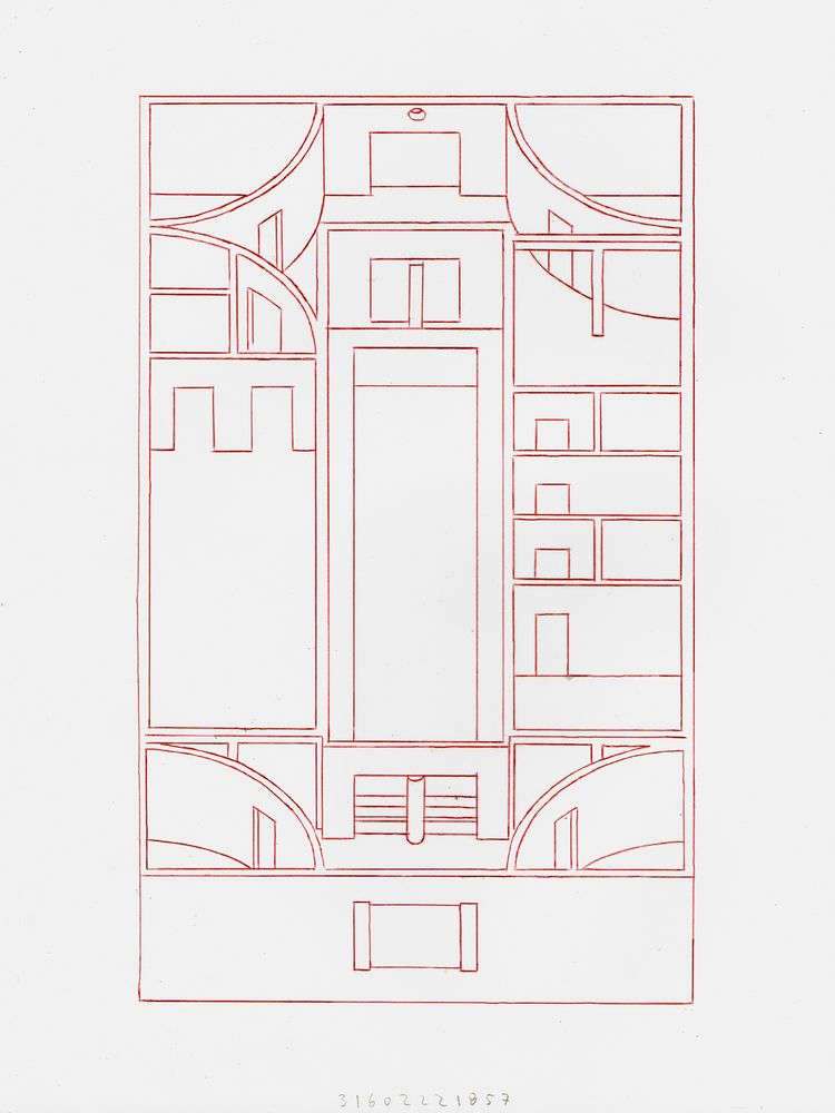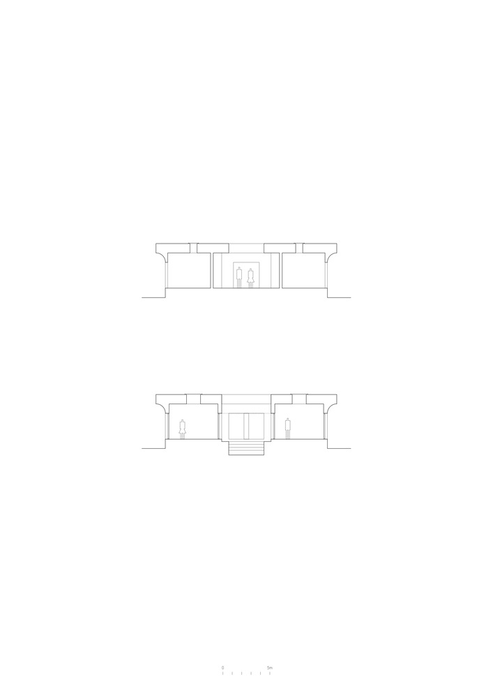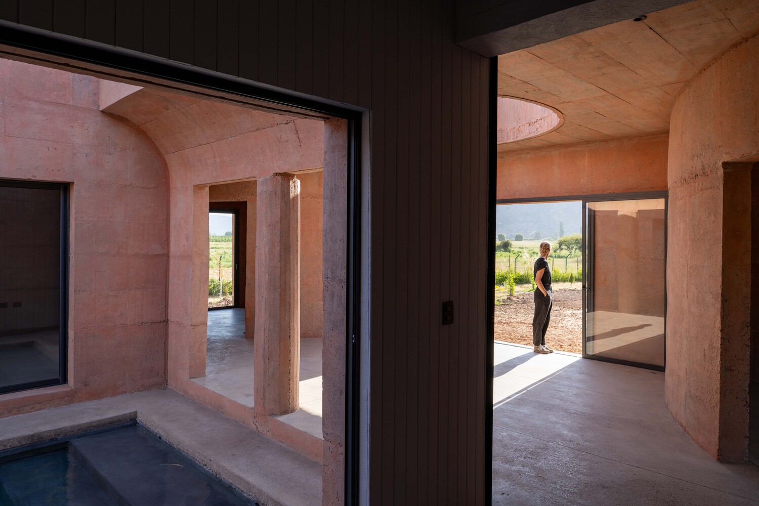 The strict symmetry of the entry rooms, with equivalent round quarters in every corner, is interrupted by an almost imperceptible transition from interior to exterior.