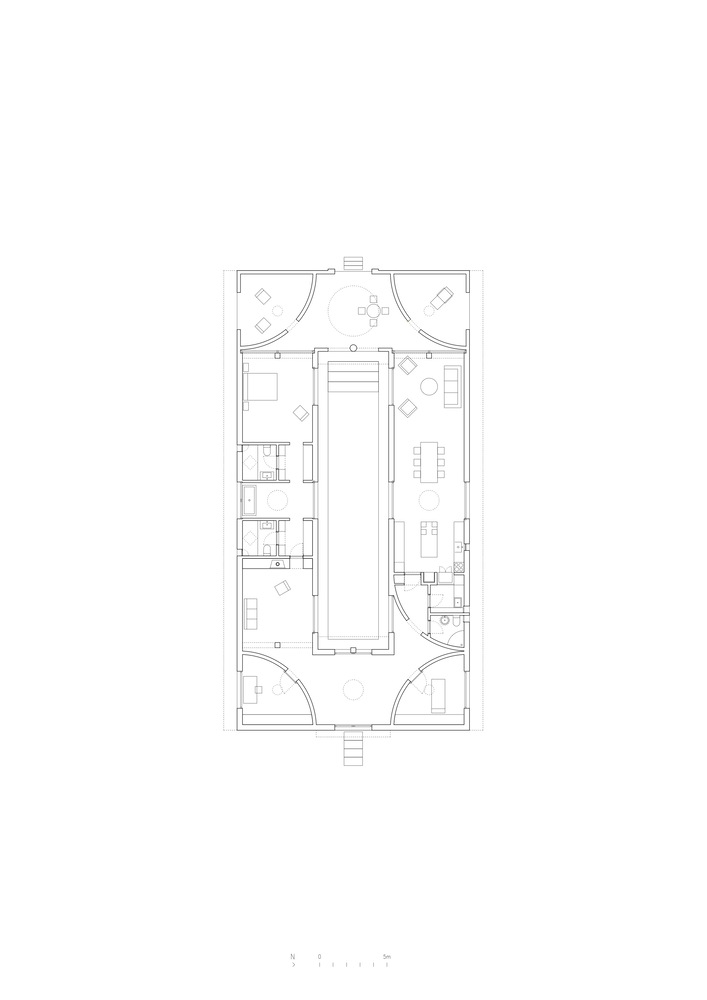 Its elongated proportion contains an even narrower courtyard, oriented to the rise and setting of the sun. The courtyard is occupied by a long swimming pool, whose sparkles animate all the rooms around it.