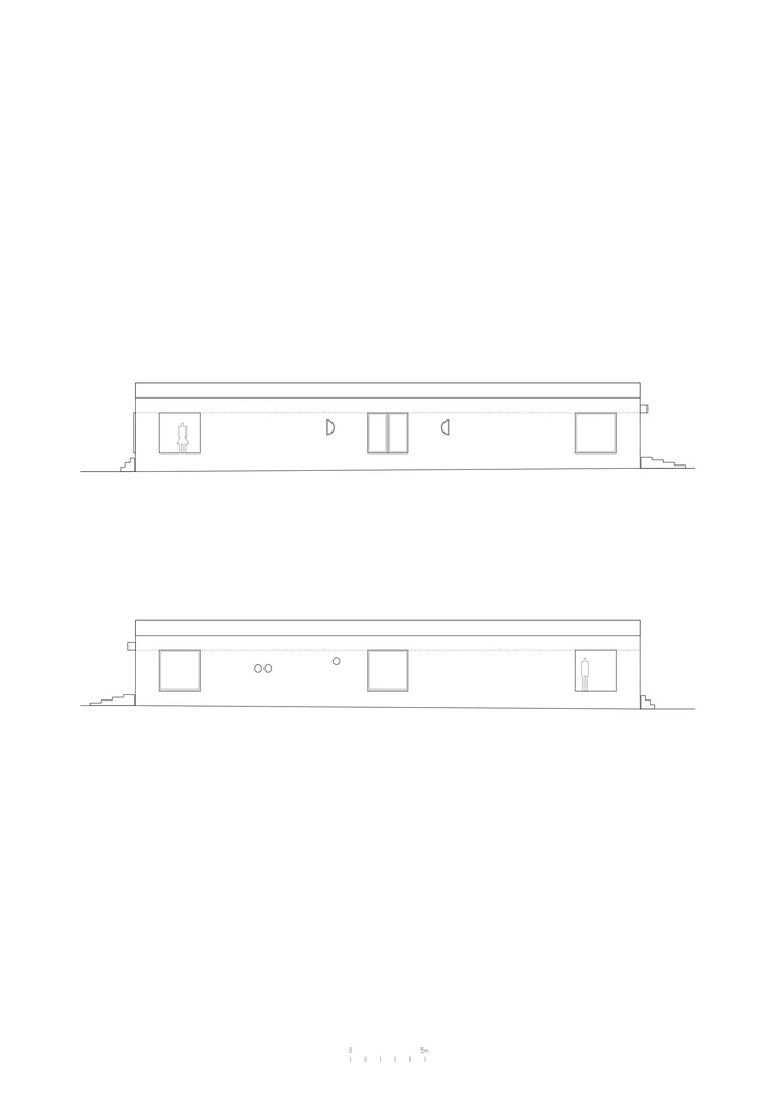 The horizontal extension of the house, noticeably elevated from the natural terrain, can be understood like a ring of rooms for an endless movement but also like a fictional encounter between to alphabetical figures (T and U). The building seems to be the silent confirmation of that illusion.