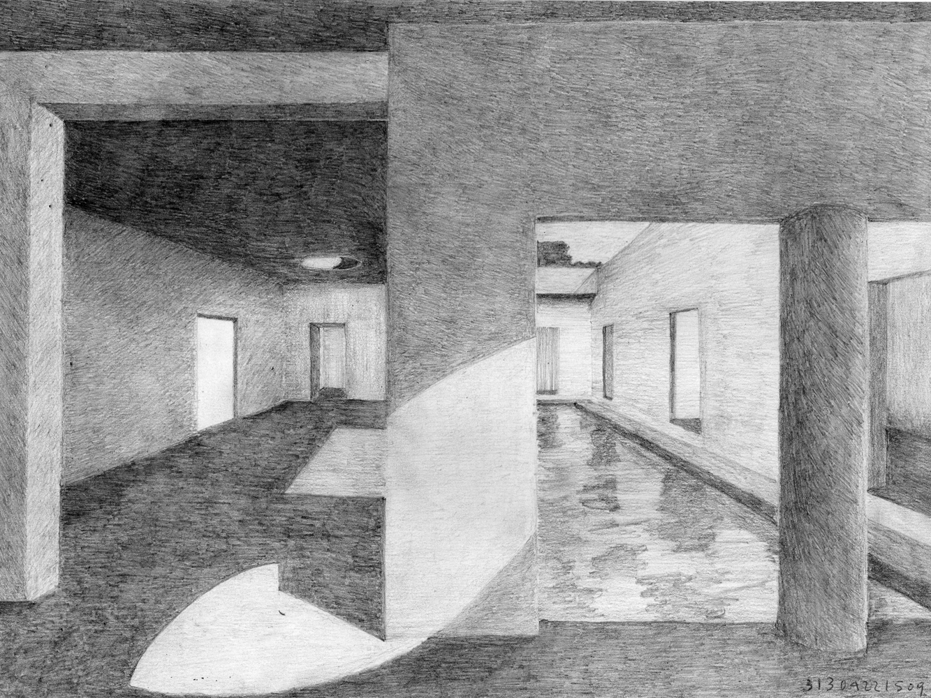 The house has a bare sequence of spaces, while also promotes a maze like feeling.