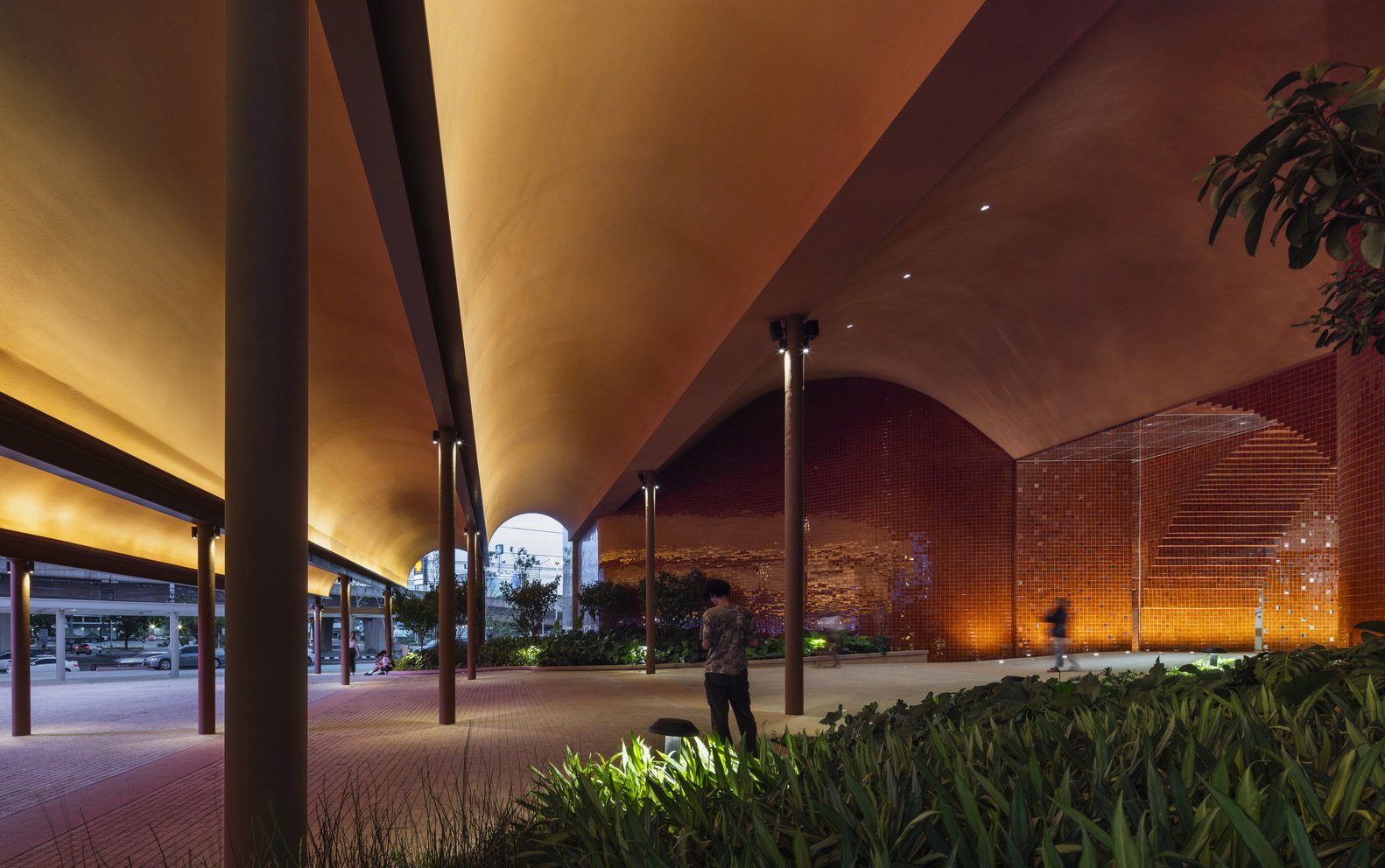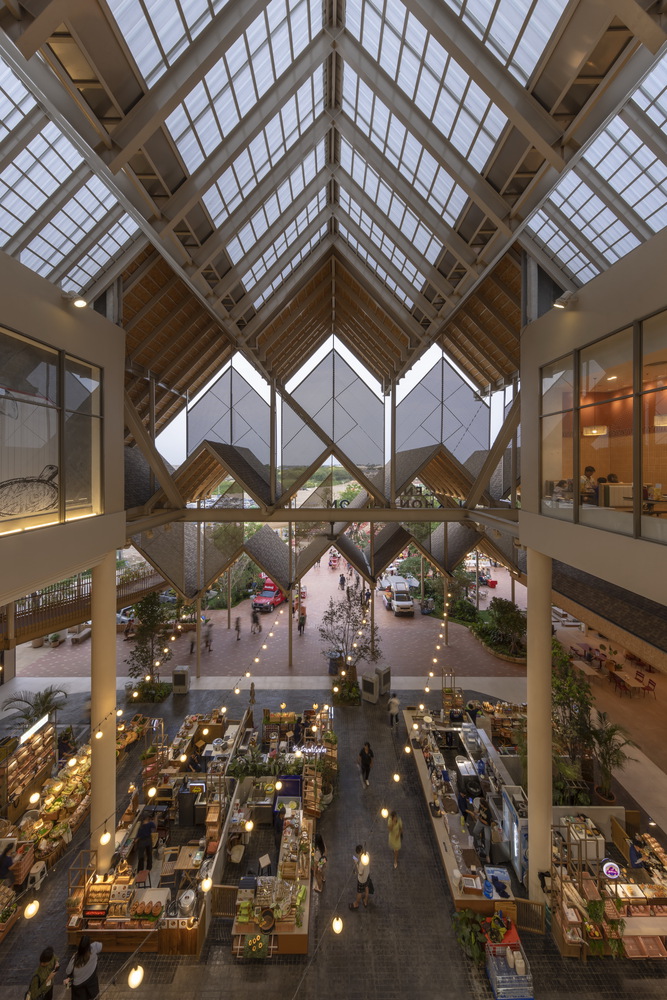 A large canopy roof shelters the area from rain, while the ceiling pattern, inspired by a checkerboard, reflects local activity patterns, adds visual interest, and helps diffuse direct sunlight to prevent overheating.