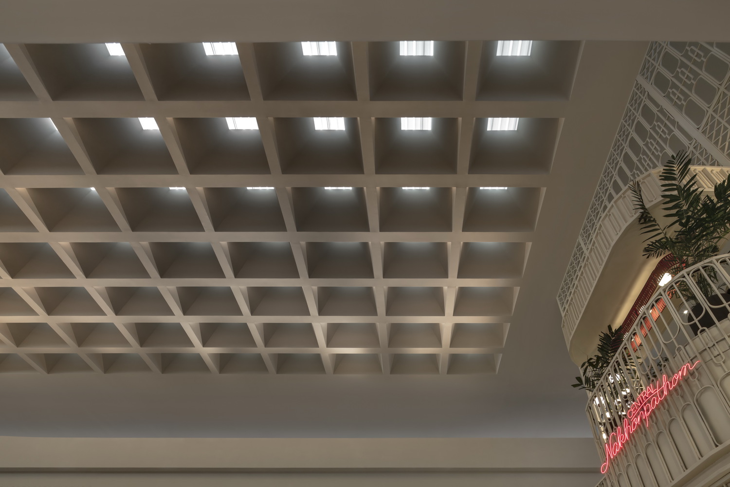 This juxtaposition is expressed across the entire front façade, where the composition is inspired by the recessed corners of Phra Pathom Chedi.