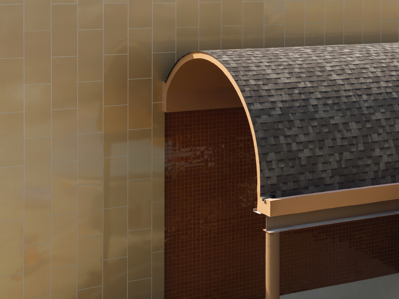 Meanwhile, the incorporation of a gabled roof shape and a checkerboard pattern introduces a sense of warmth and familiarity, grounding the project in its everyday cultural context.