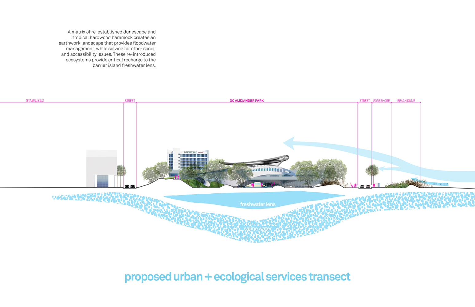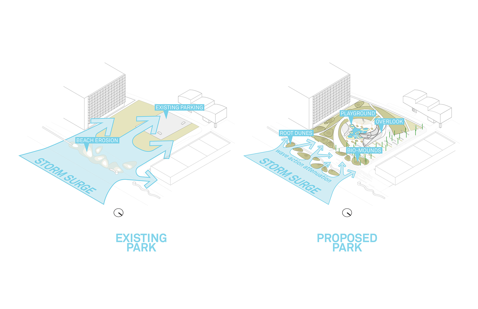 The upland coastal ecosystem includes both vegetated "root" dunes and rubberized surfaces to protect landward investments from storm surge as well as serve as "boundless" playscape.
