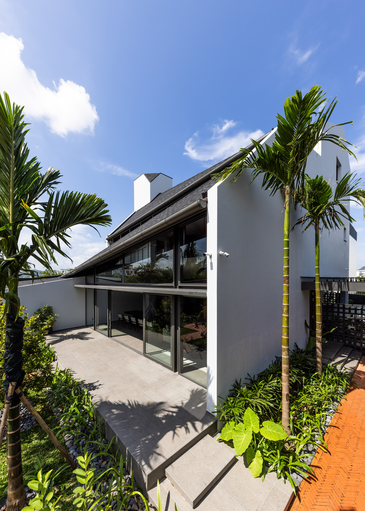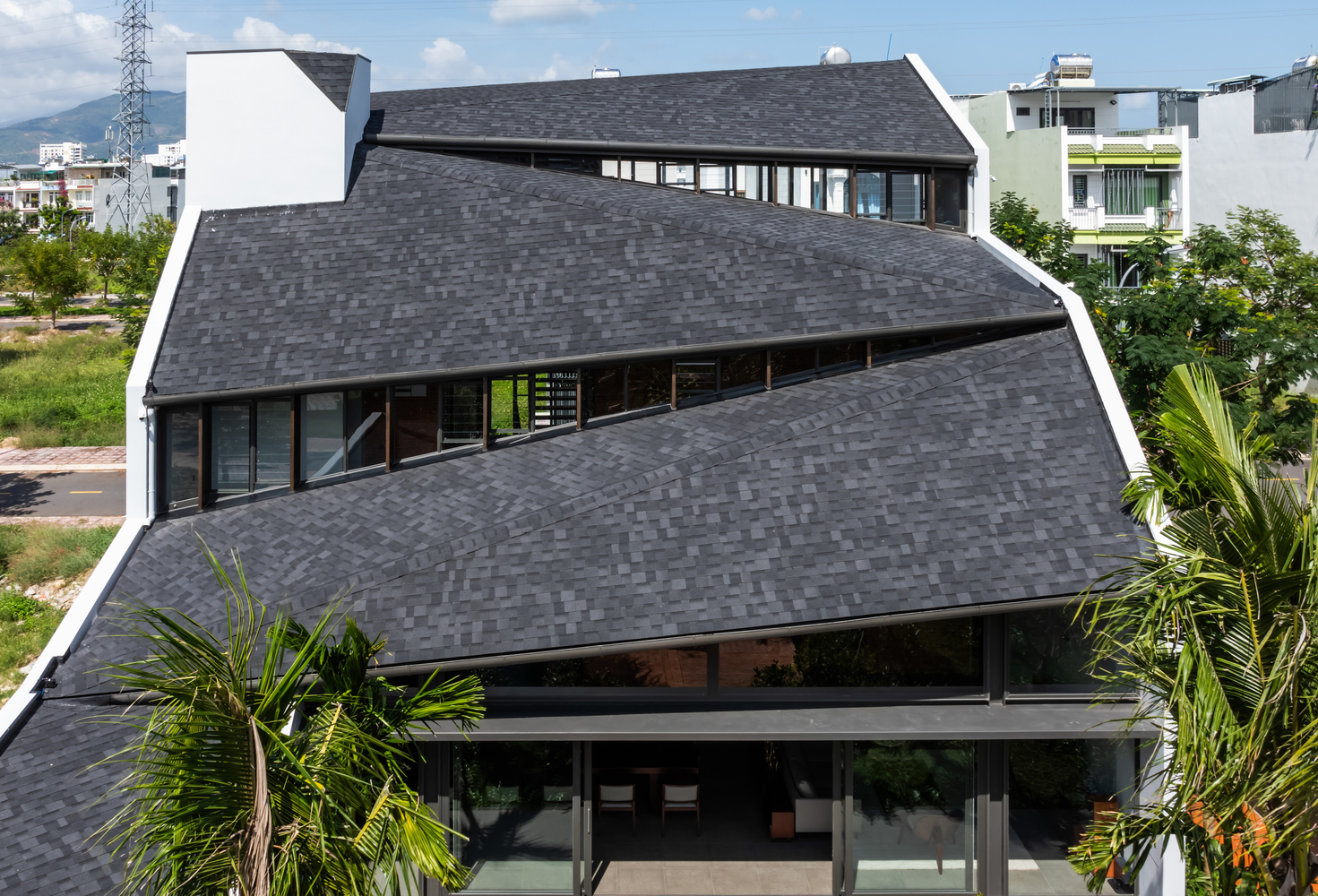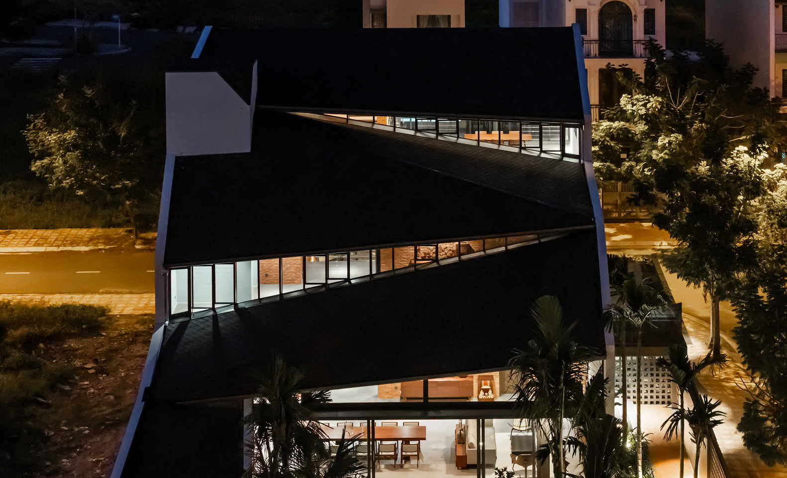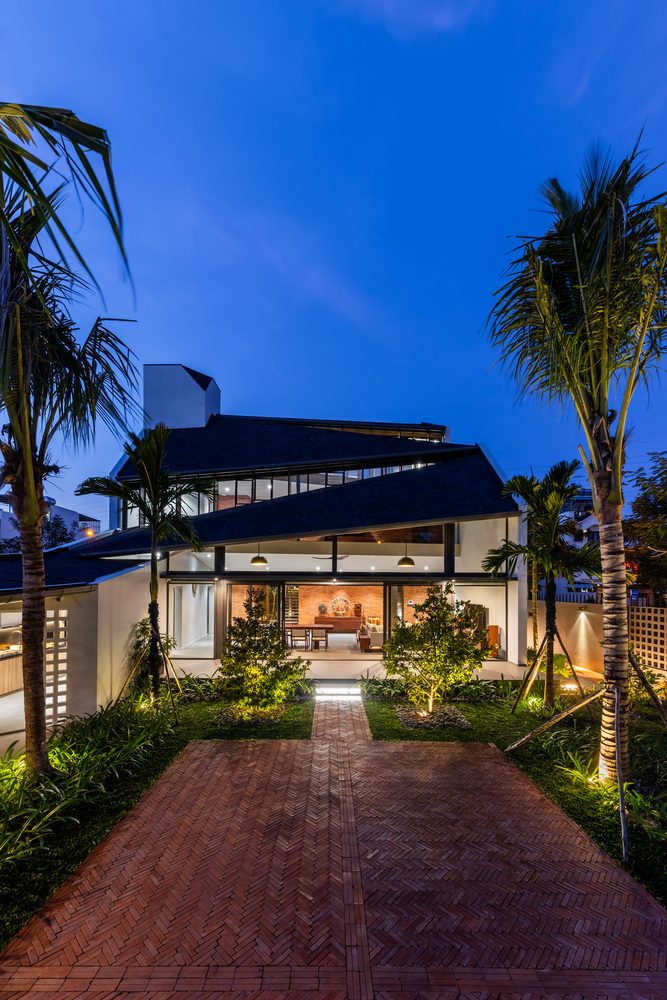 These roofs cover both exterior and interior spaces, creating a single continuous living space stretching from the garden on the ground all the way to the study at the top.
