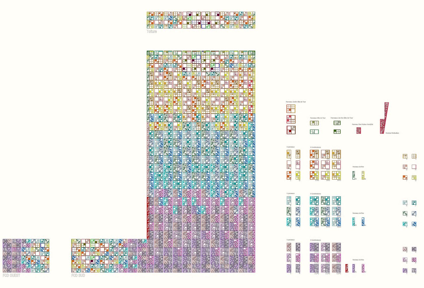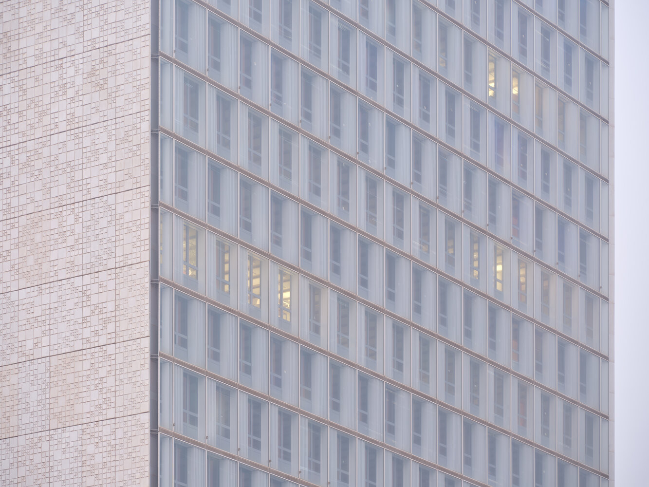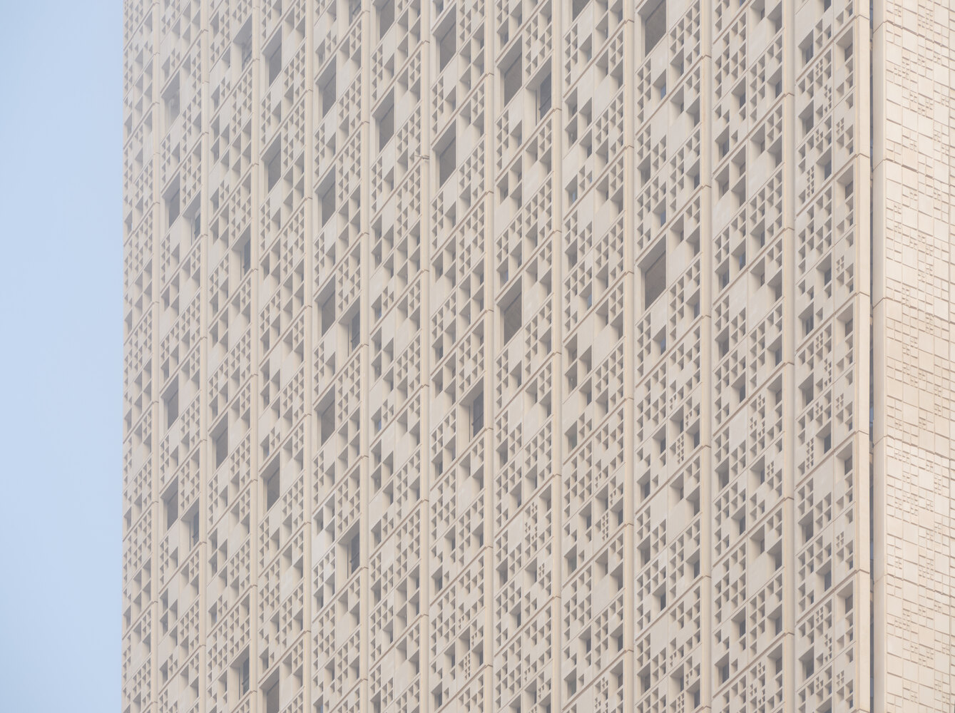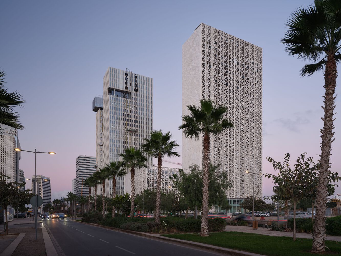 The south facade, doubled with a white concrete moucharabieh, creates a deep texture whose pattern expands with height, accentuating the elevation and dematerialization of the tower.