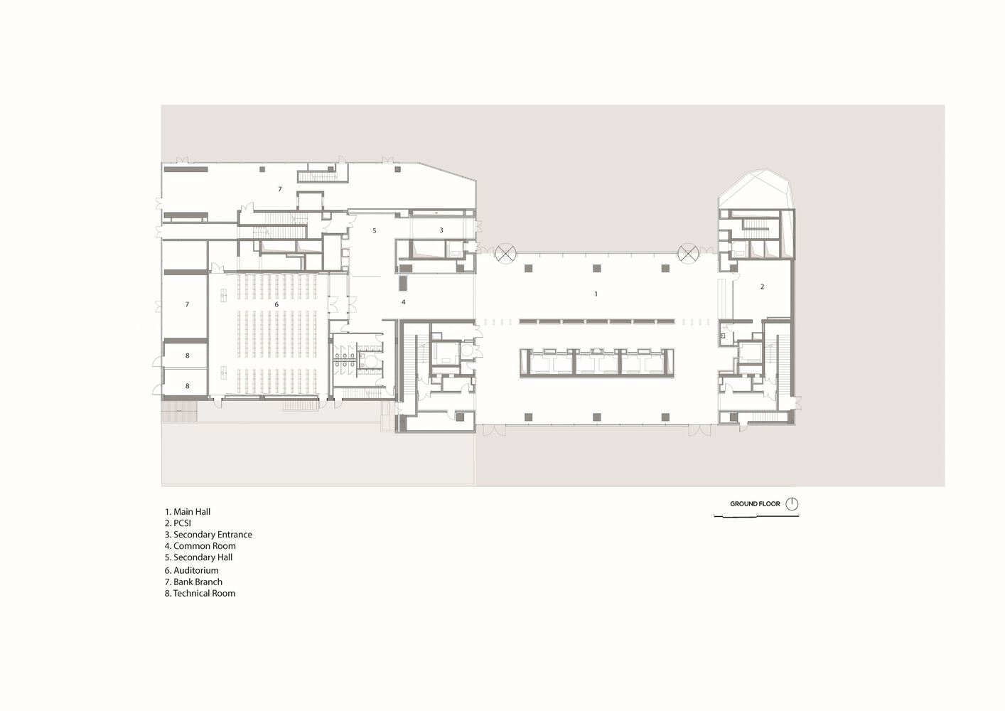 This plaza serves as a symbolic threshold, where public space and the institution merge to affirm the identity of a bank in service to the community.