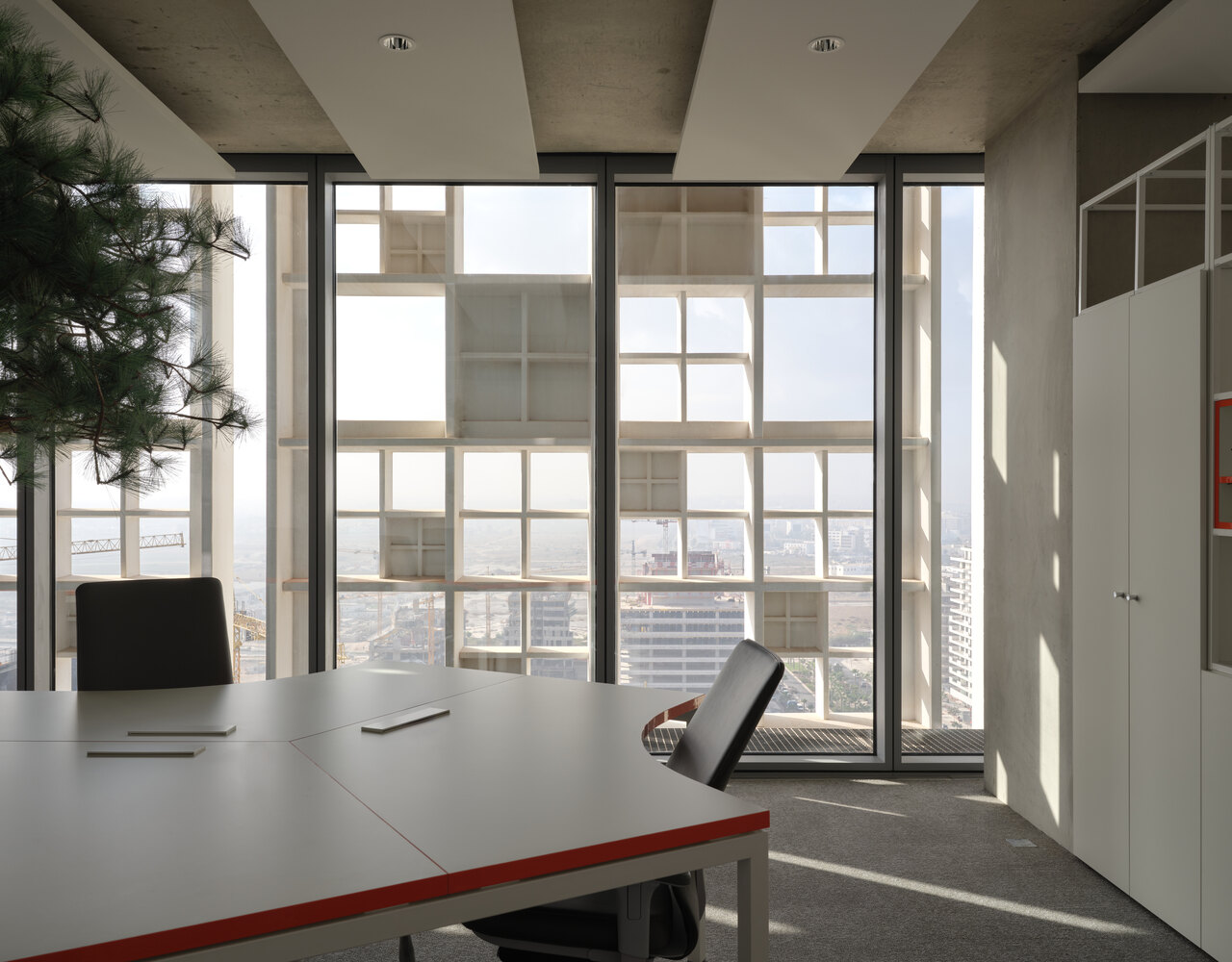 Thus, the fully glazed north facade facing the sea horizon is an abstract system of a thin double-skin enriched with kinetic motorized sunshades, expressing the future, transparency, and foresight.