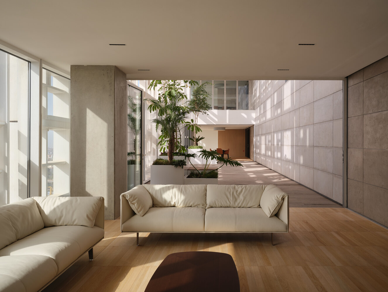 Emerging from a podium of 4 levels, which organizes all shared functions and ensures a pedestrian scale, the tower stretches its refined silhouette over 19 levels of standard floors and 2 levels dedicated to governance functions.
