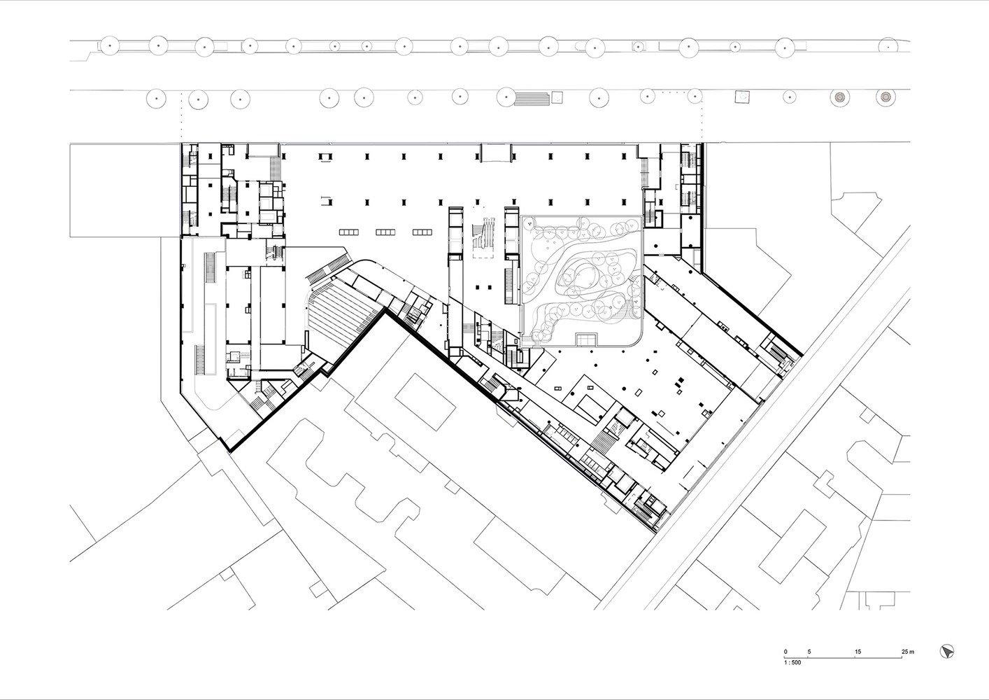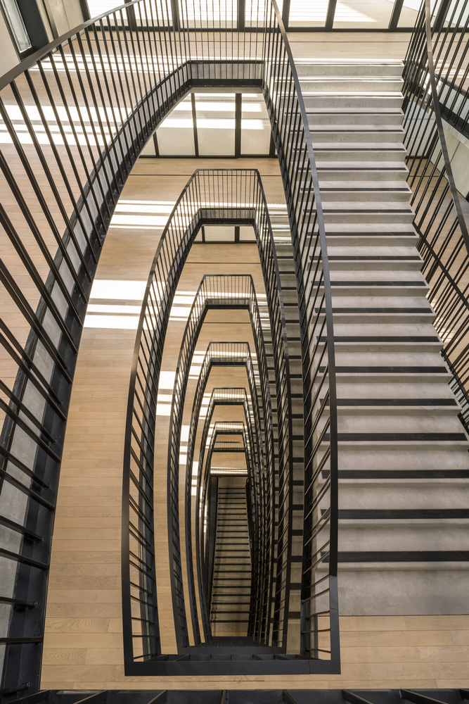 The office building with its agora and a conference centre extends over two courtyards from Avenue de la Grande Armée to Rue Pergolèse with a perimeter block development that has been broken up with generous green areas.