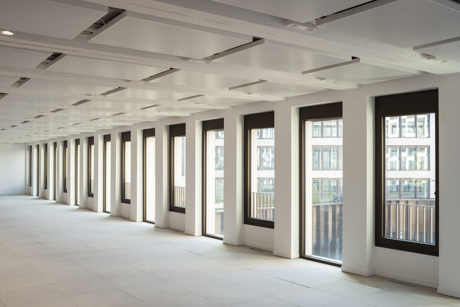 The project, with its 35,000 square metres of gross floor area, transforms the working world into a living world: open office structures, the former showrooms on the ground floor and spacious open areas combine to create a cosmos that is only partially dedicated to traditional desk work.