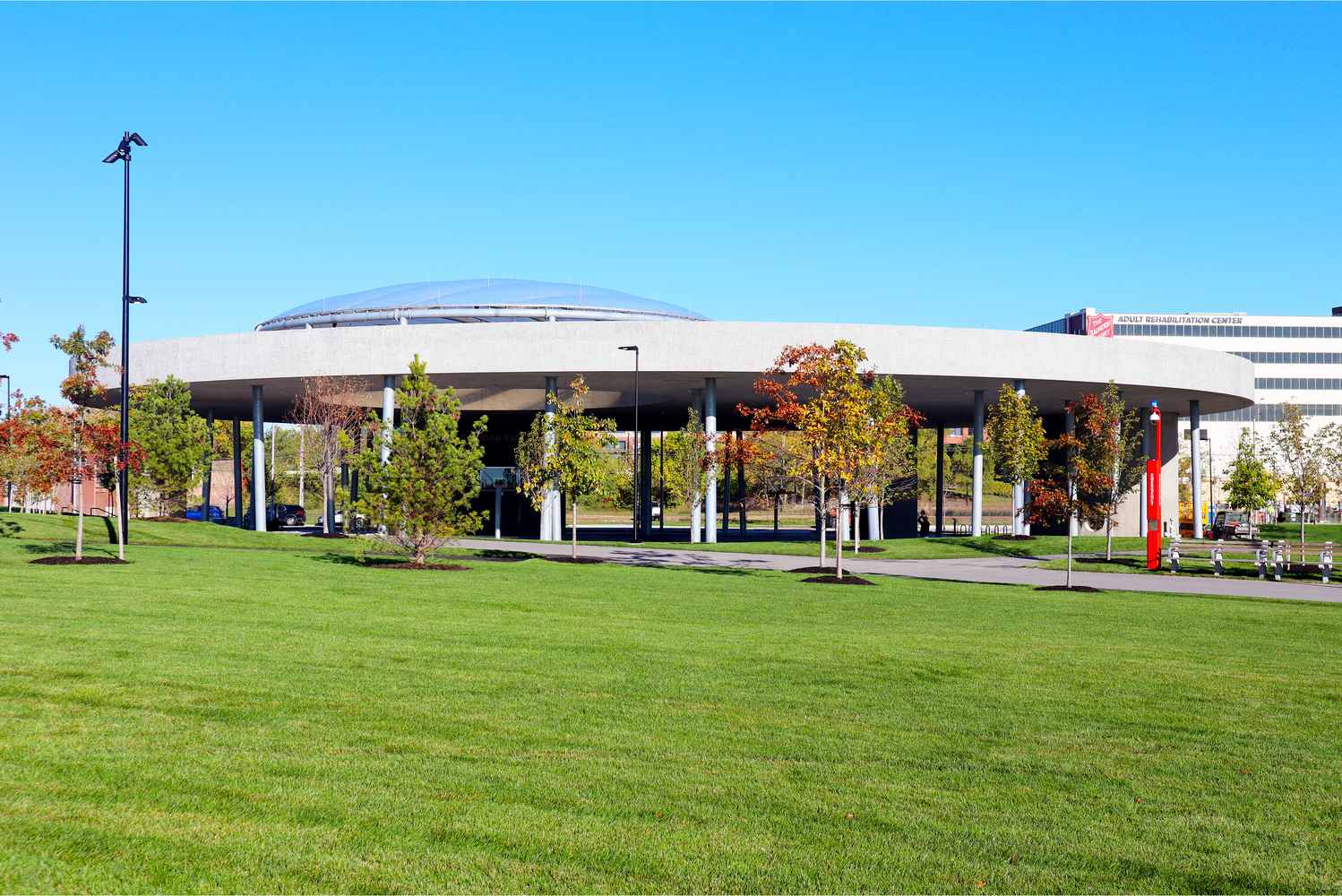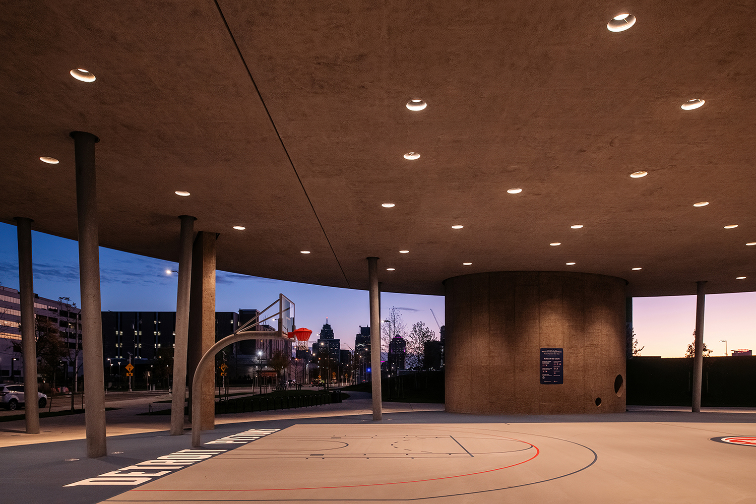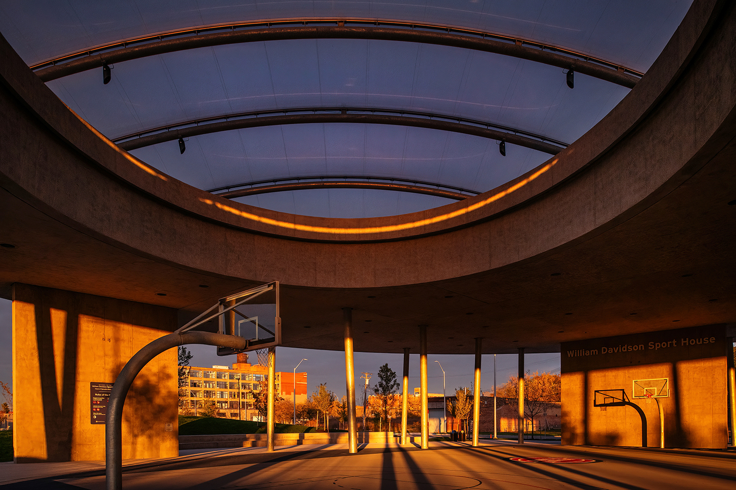 The William Davidson Sport House, a striking structure housing a full-size basketball court beneath a sculpted concrete canopy, offers year-round recreation and shelter.