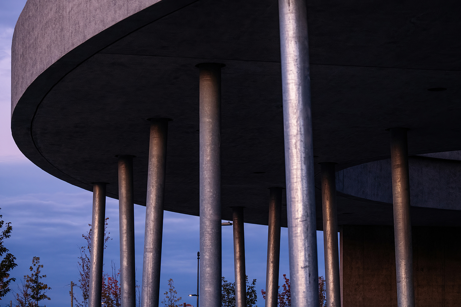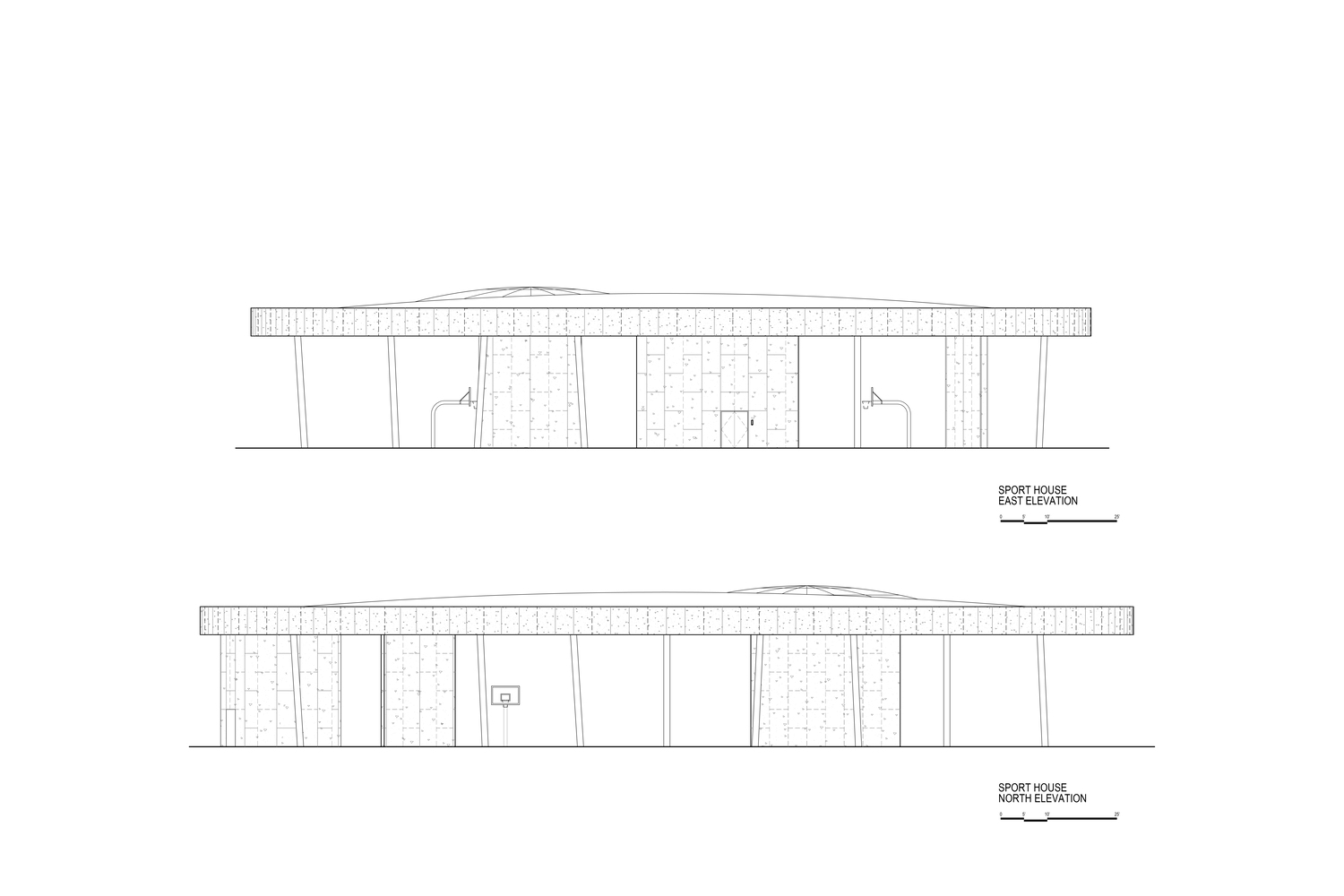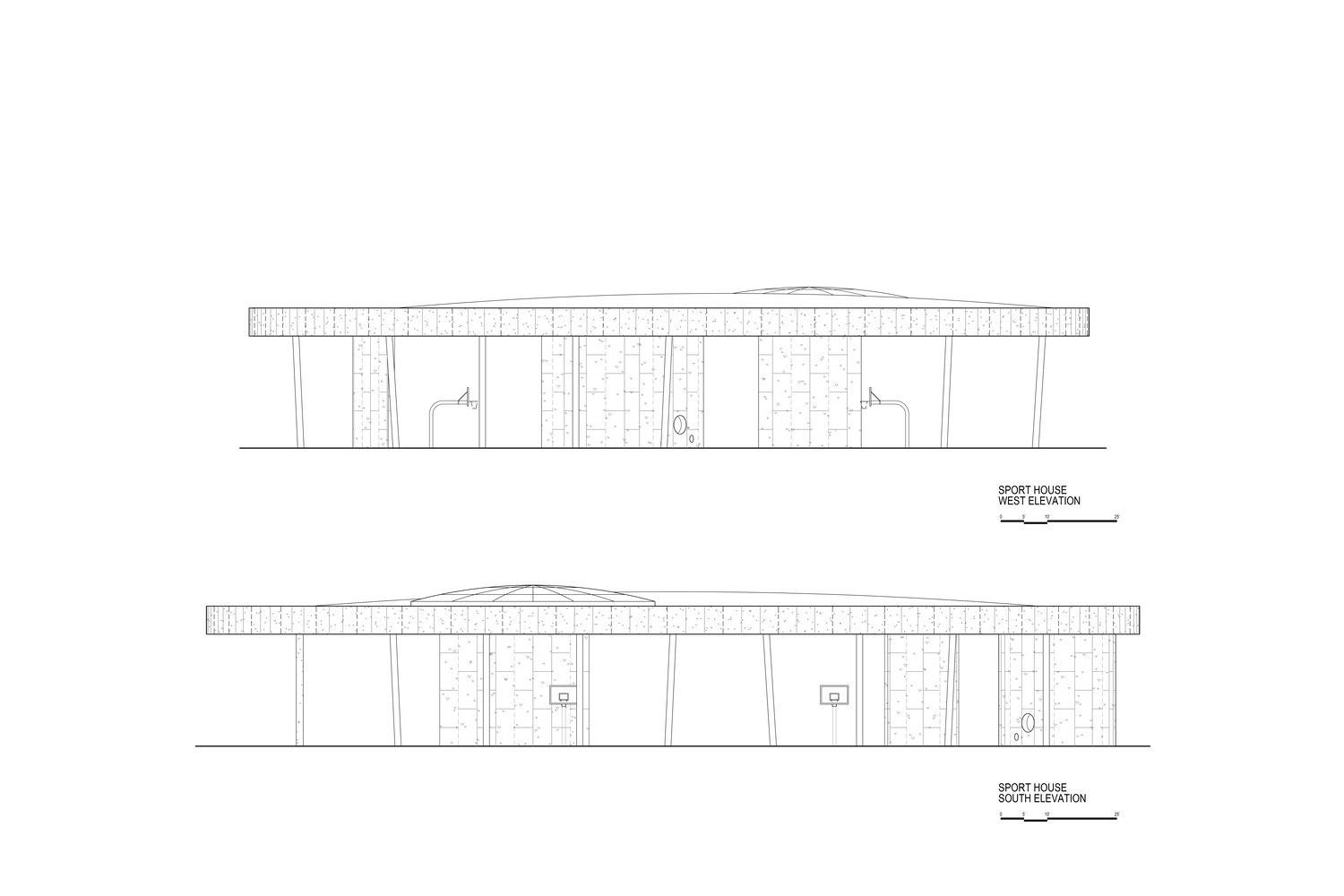 The William Davidson Sport House is a 28,000 sq ft pavilion with 33 steel columns supporting a sculptural concrete roof topped by an expansive skylight of approximately 2,000 sq ft.