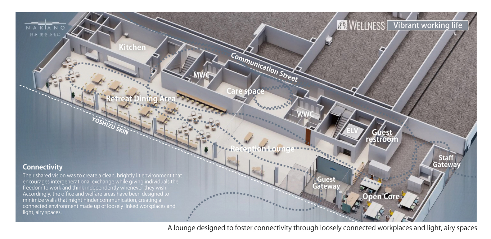 By introducing the concept of Open Communication Working (OCW), which is designed to enhance production efficiency through interpersonal interaction, an open office conducive to intergenerational communication has been created.