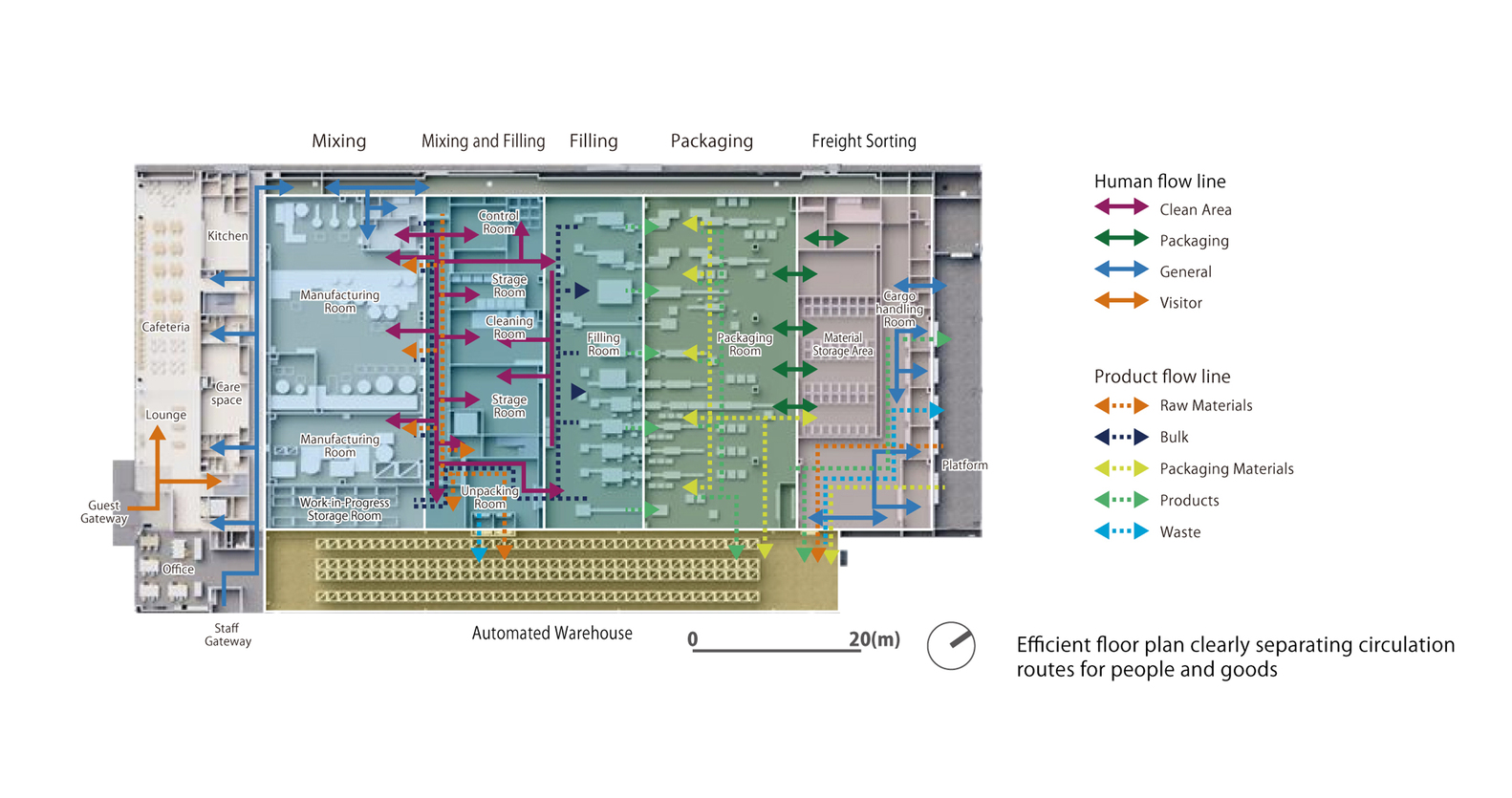 A simple and streamlined planning was achieved by clearly separating the flow of people and goods, enabling the entire production process—from manufacturing and filling to packaging and shipping—to be completed on a single floor.