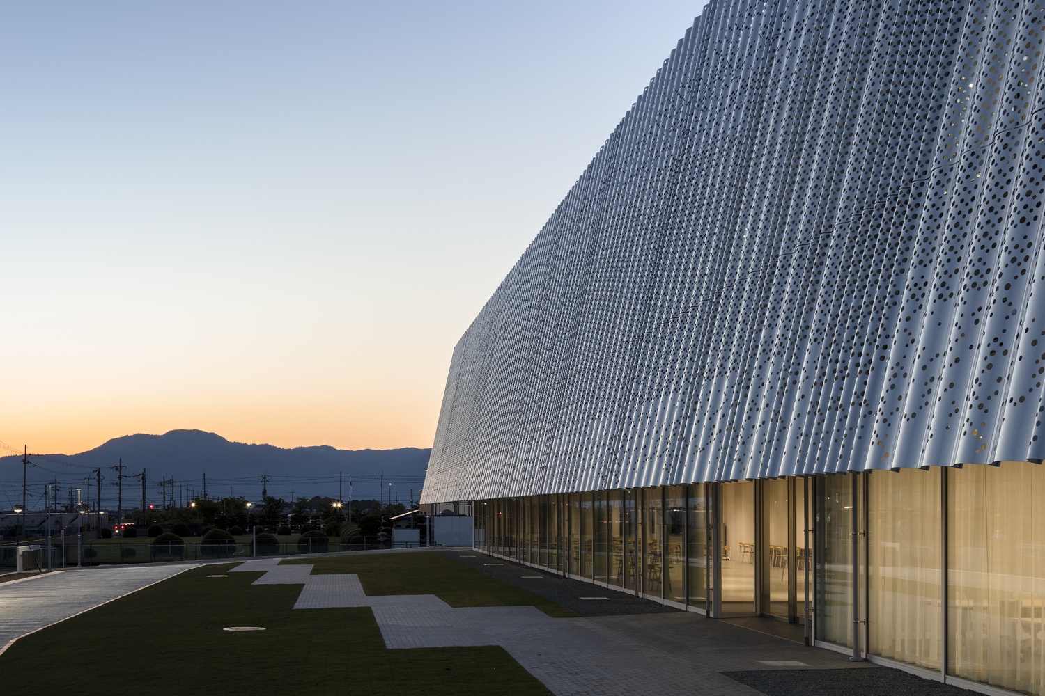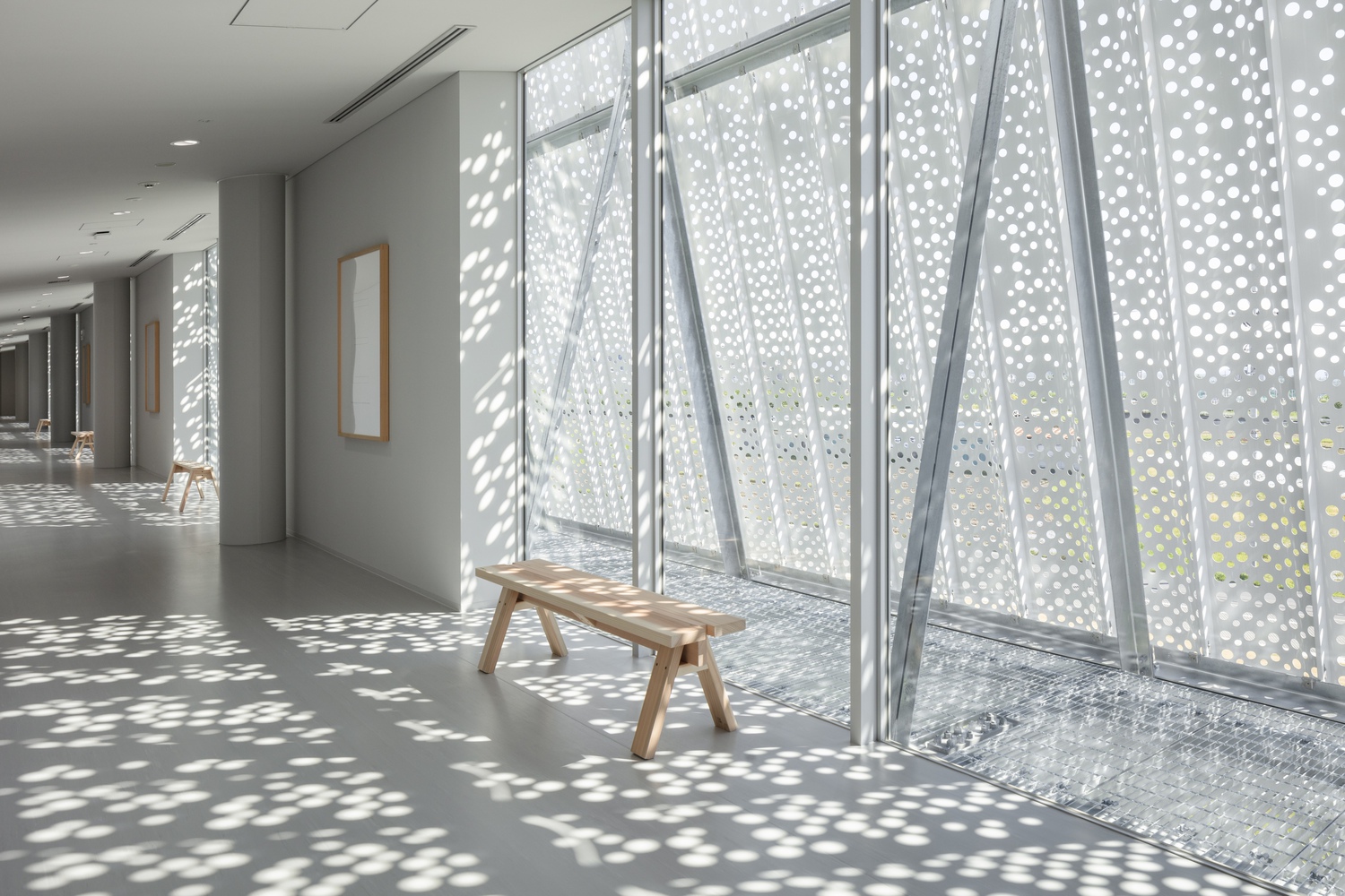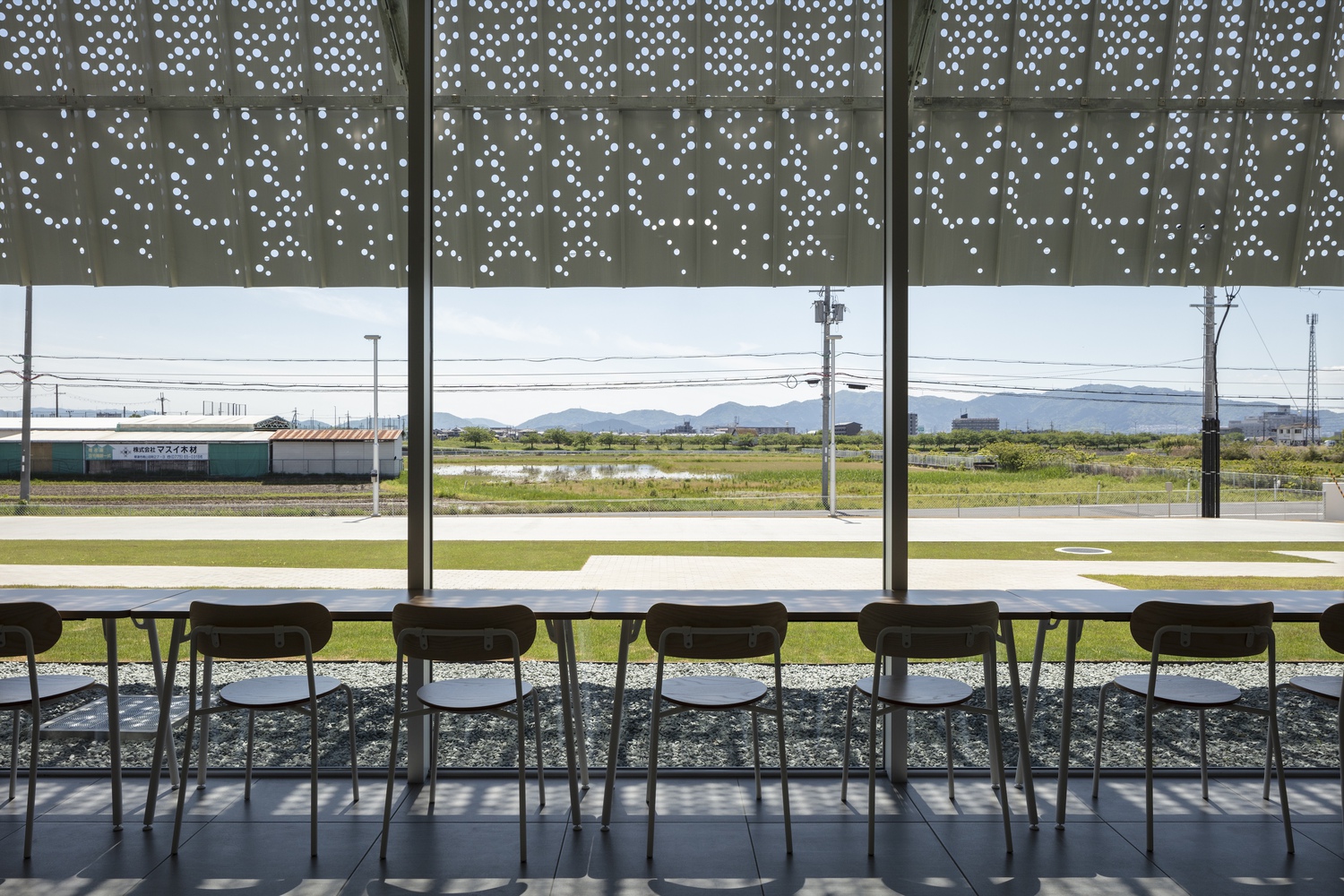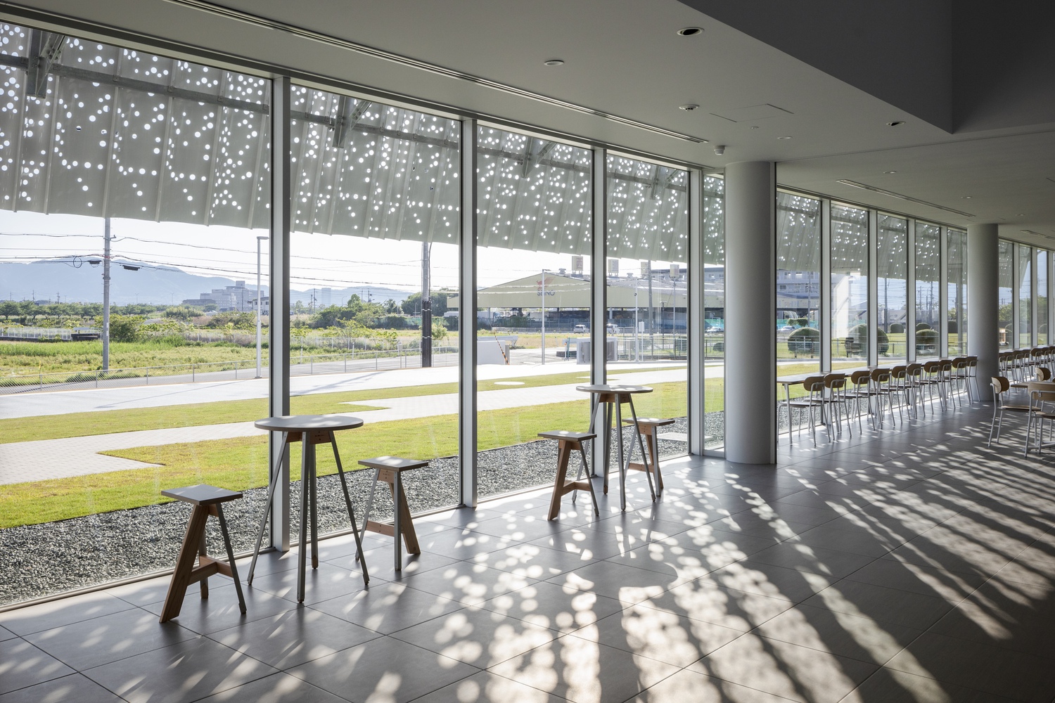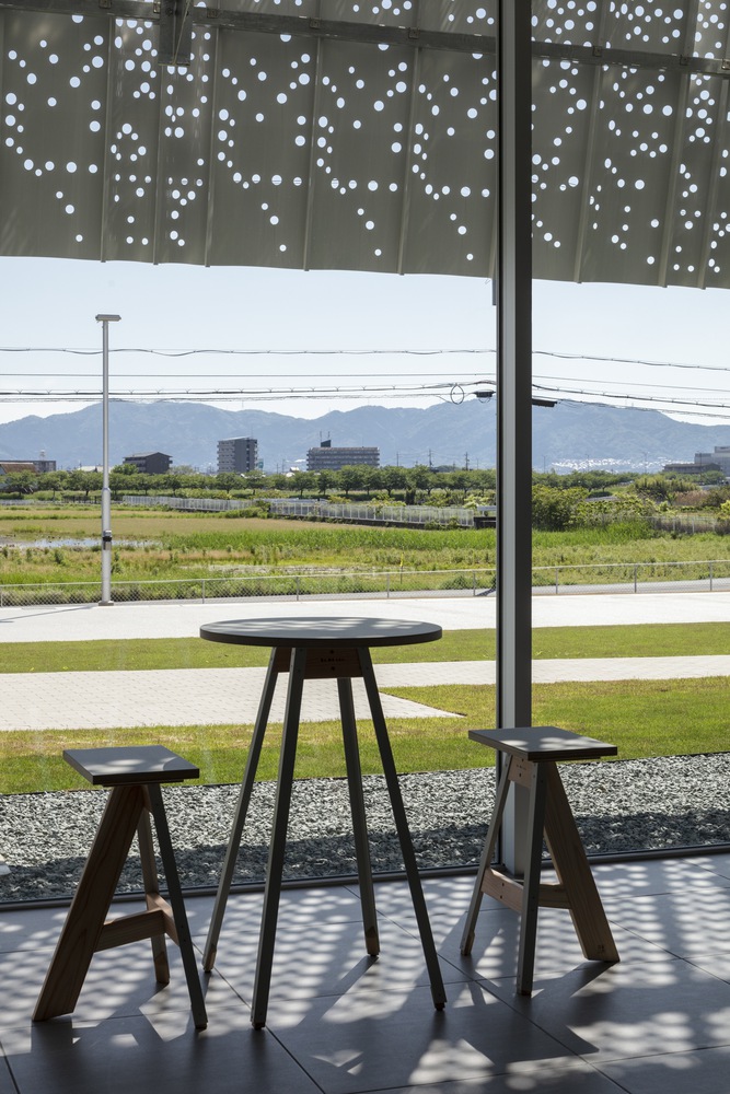 Positioned at an angle as if leaning against the wall, the flexible screen with a porous surface, inspired by the gentle waves and shimmering reflections of Lake Biwa, creates a sun-dappled intermediate space between indoor and outdoor areas, helping to mitigate the thermal load due to sunlight.