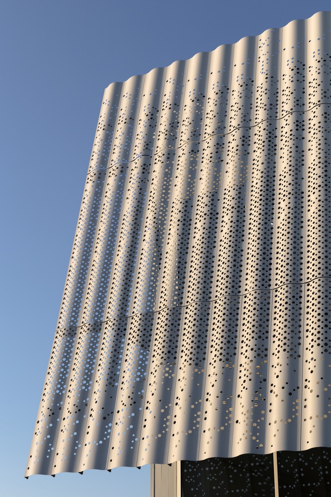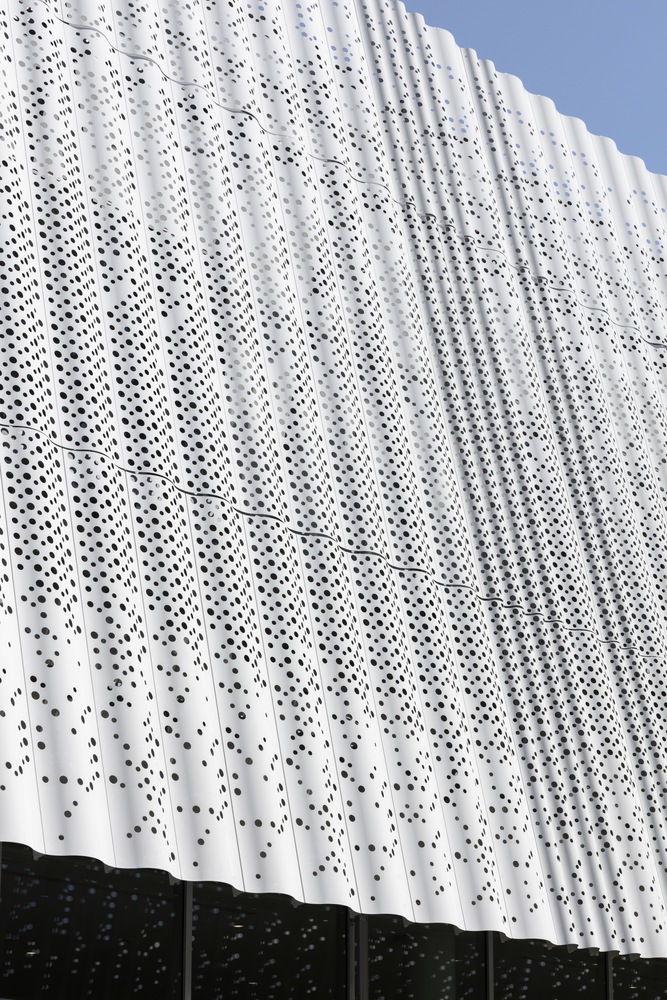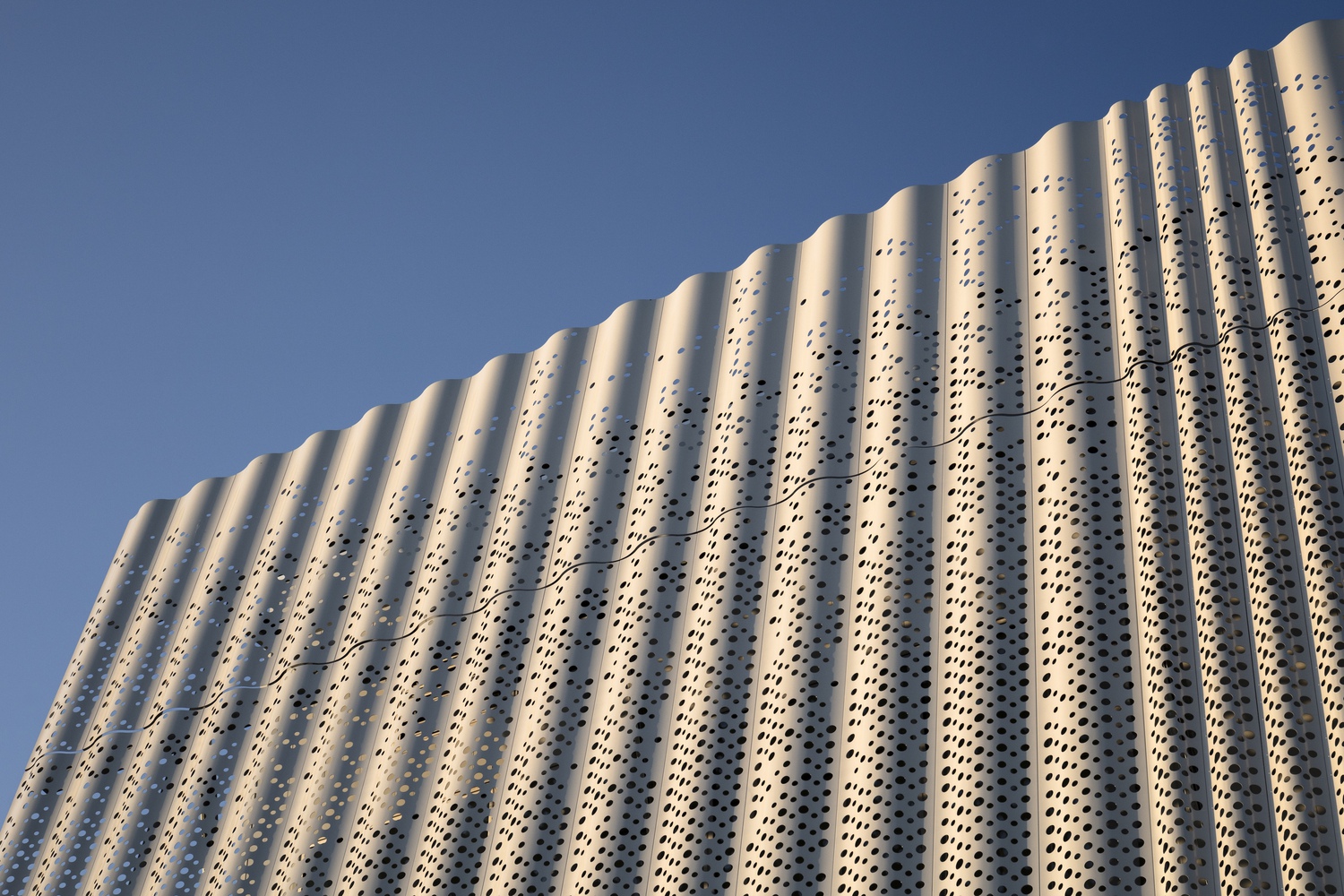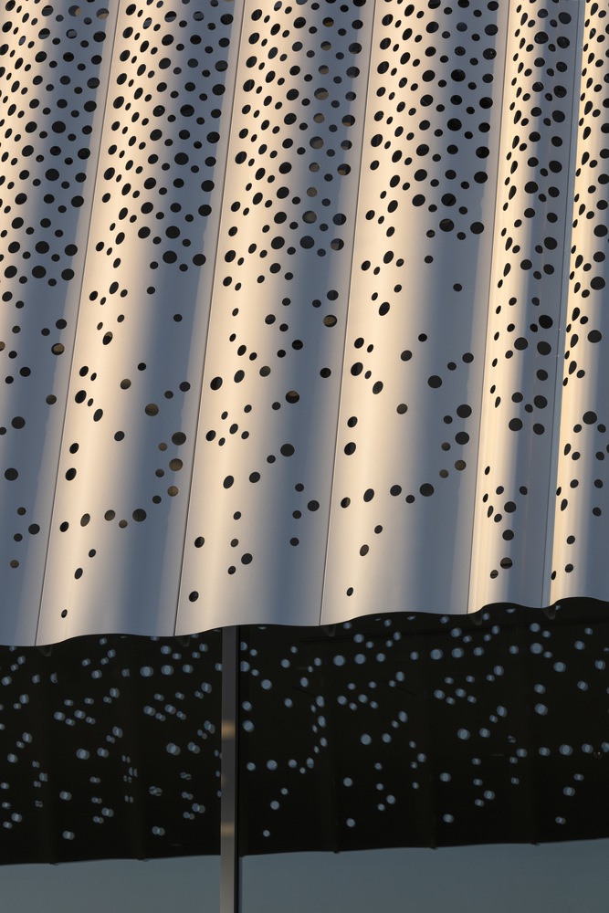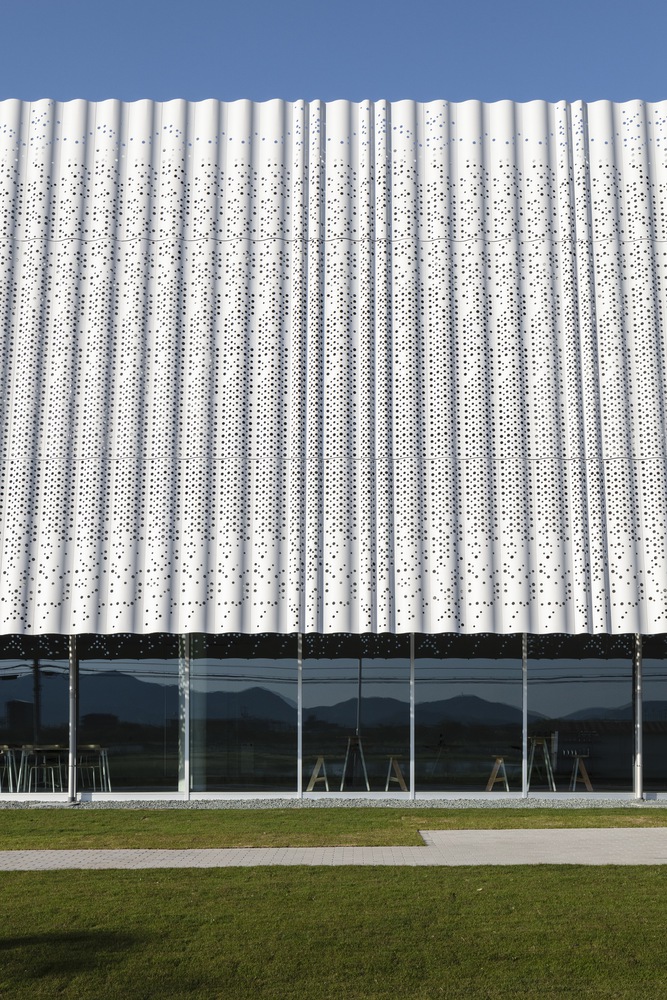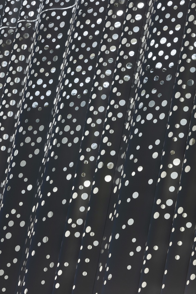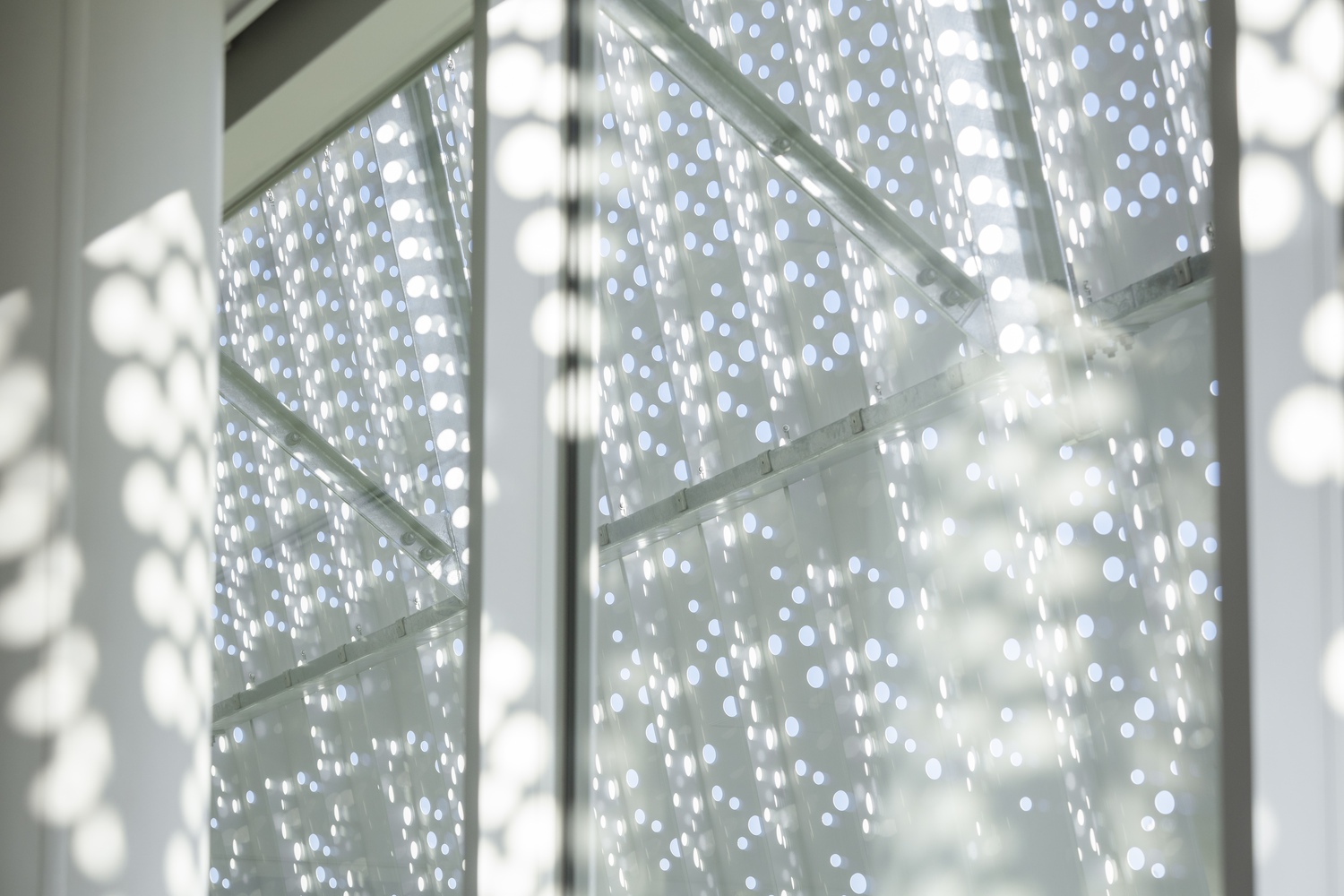 Positioned at an angle as if leaning against the wall, the flexible screen with a porous surface, inspired by the gentle waves and shimmering reflections of Lake Biwa, creates a sun-dappled intermediate space between indoor and outdoor areas, helping to mitigate the thermal load due to sunlight.