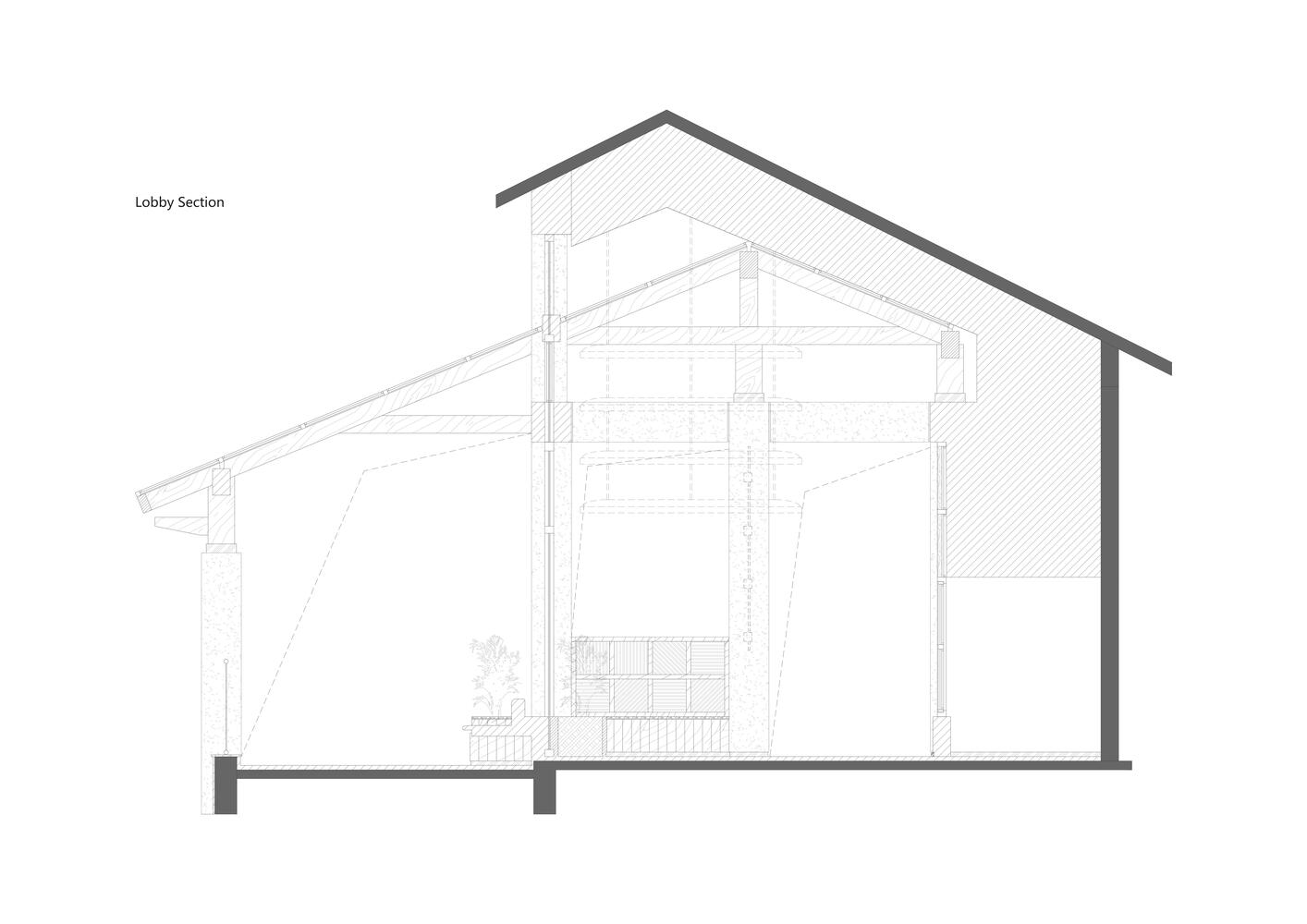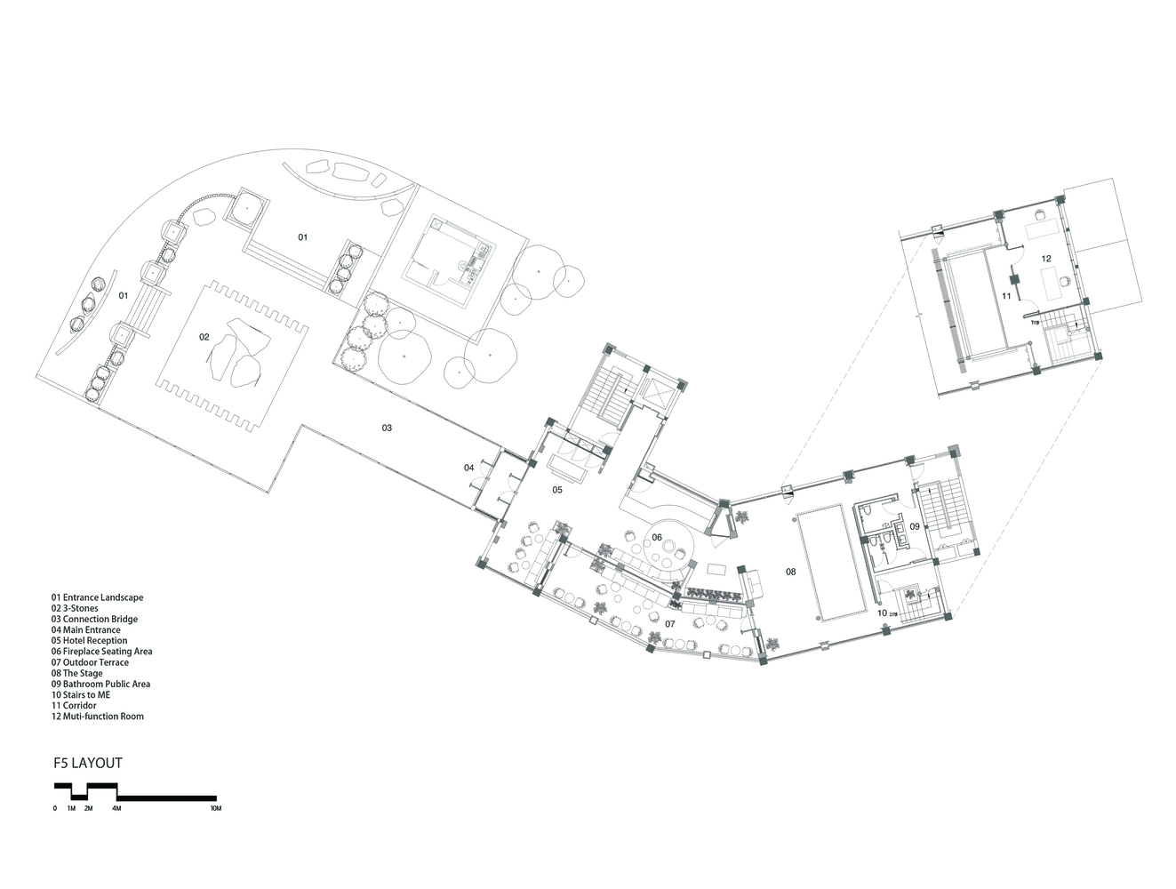 Entering from the top level, visitors arrive at the reception floor where functions unfold along the building's linear plan—lobby, lounge bar, multifunctional stage, and mezzanine offices—all facing panoramic mountain views.