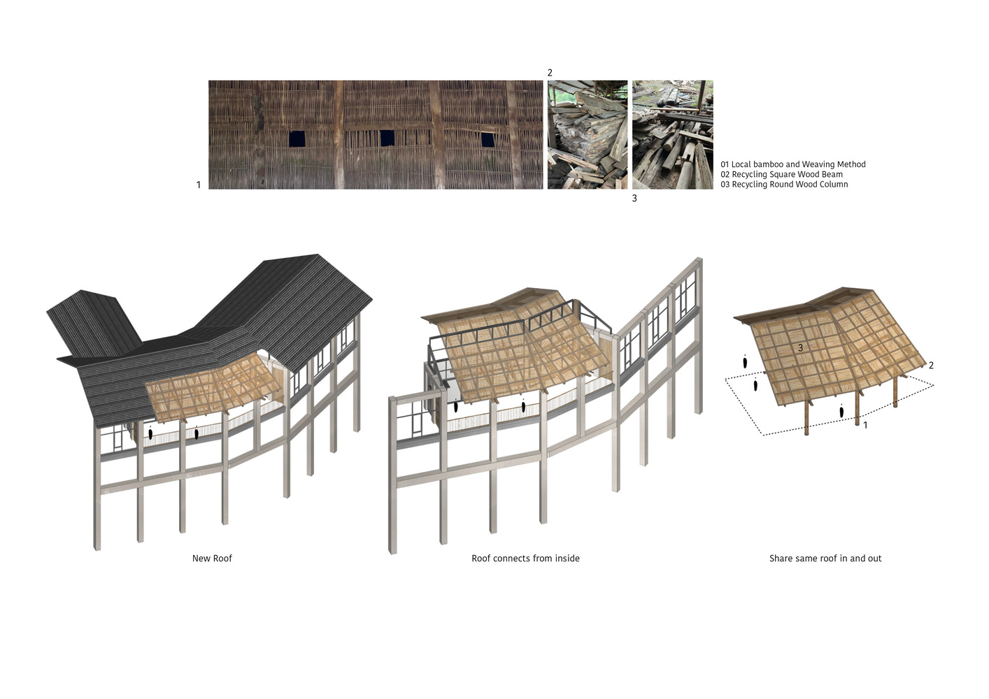 The top balcony extends the building's timber framework outward to form a semi-open bamboo canopy that blurs boundaries between interior and exterior.