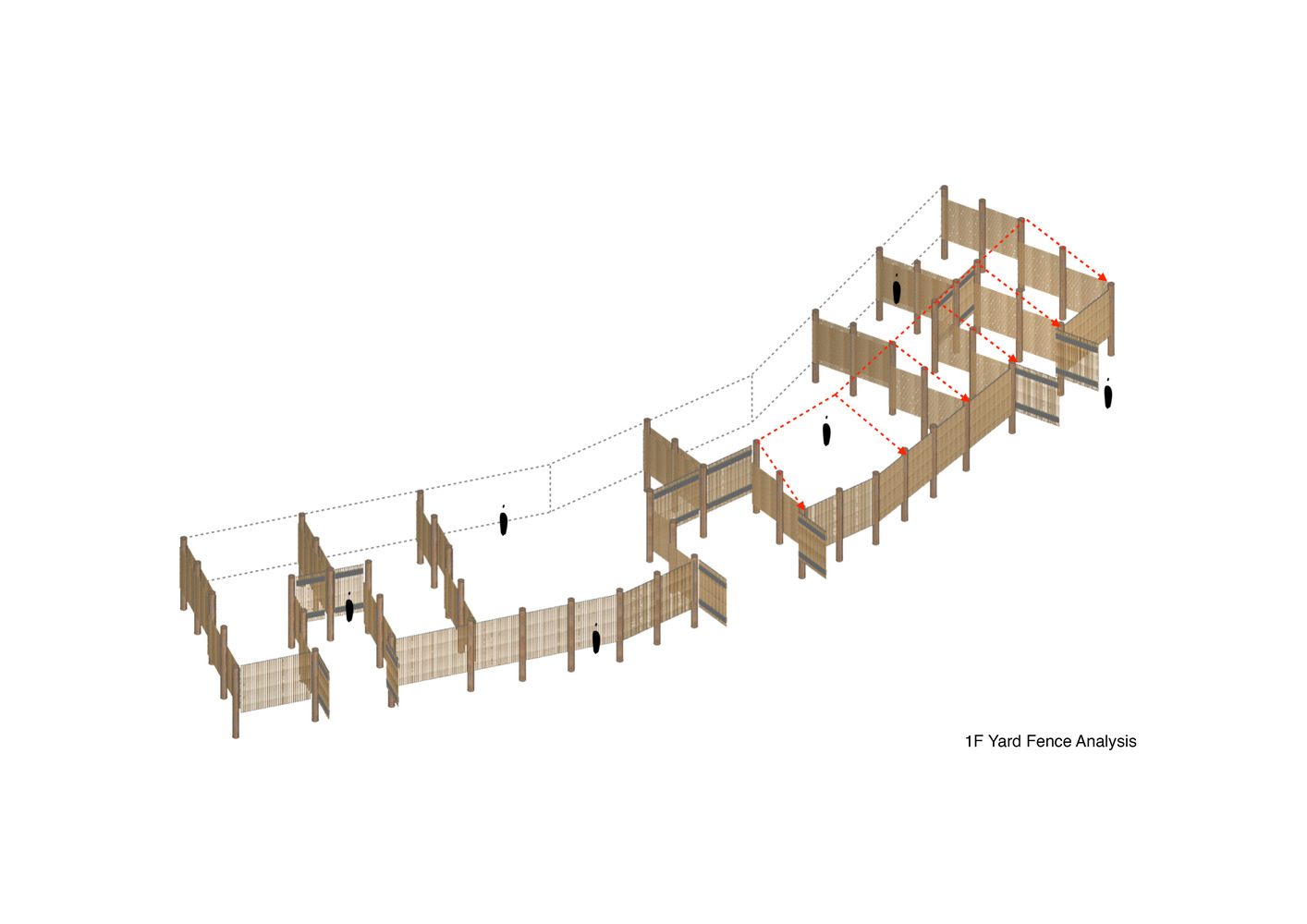 Recycled timber with rough textures was carbonized and combined with concrete core waste from renovation to create partitions and visual barriers.