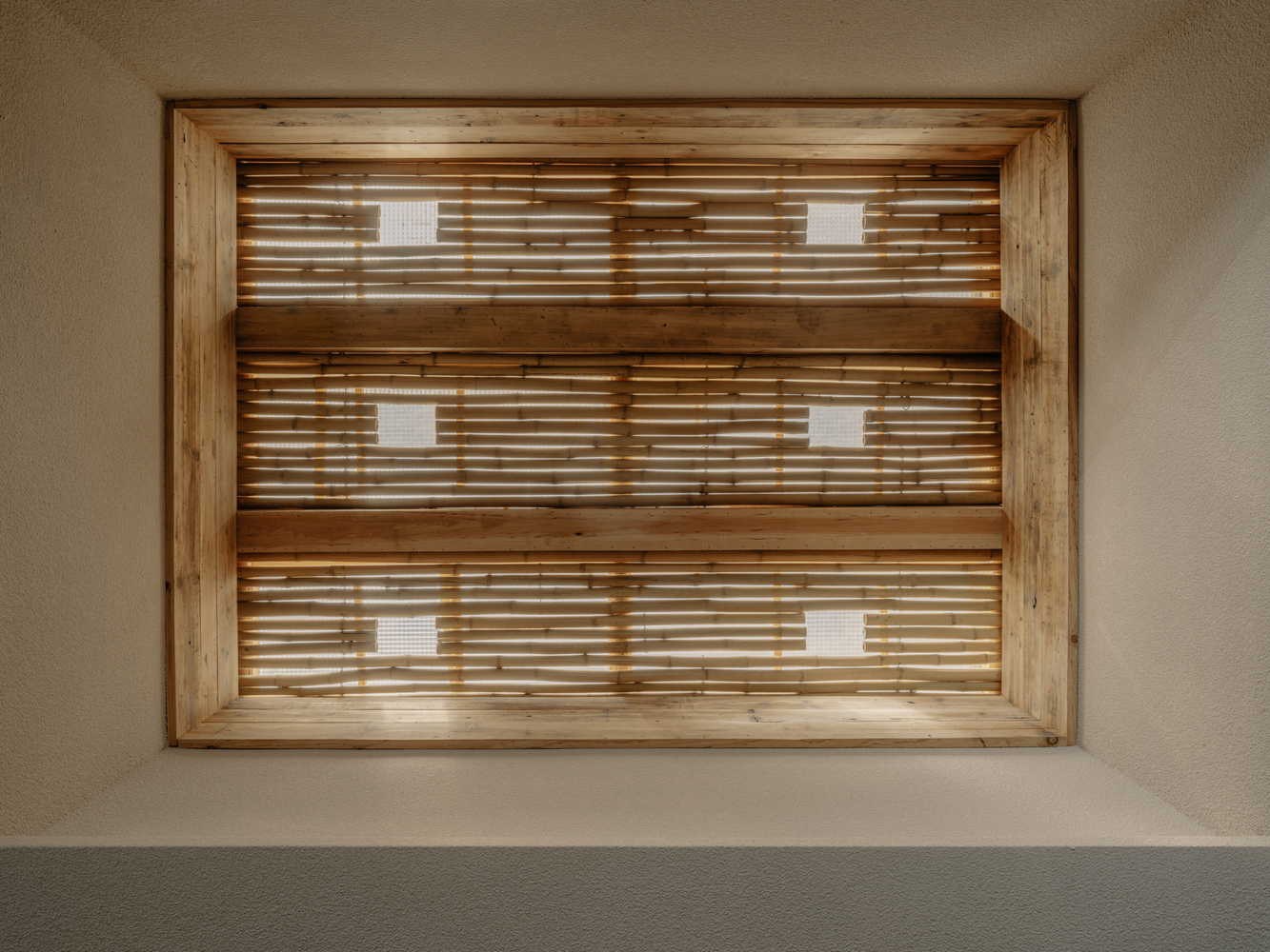 Its construction maximizes the reuse of on-site and leftover materials—demolished red bricks, bamboo treads, semi-finished woven pieces, and reclaimed stones—integrating them into walls, ceilings, and terrazzo flooring.