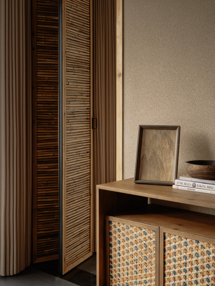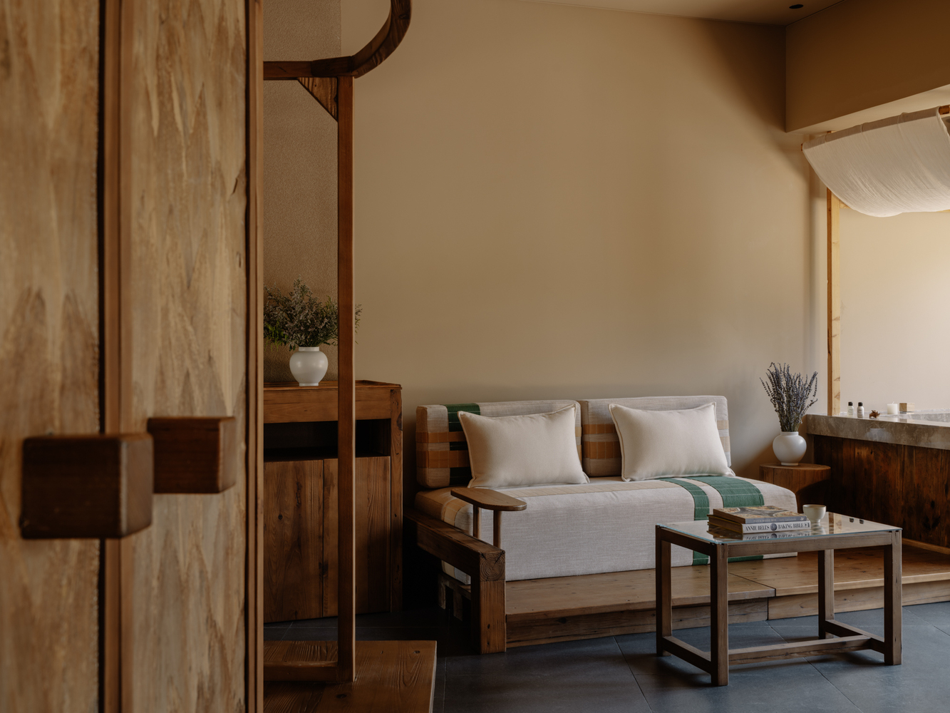 Earth-toned palettes connect natural materials, structural frames, and crafted details, extending the hotel's design language into private spaces that feel calm, grounded, and connected to nature.