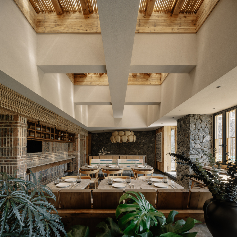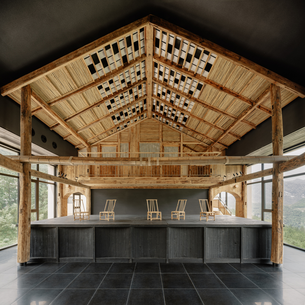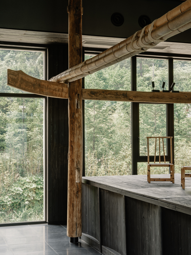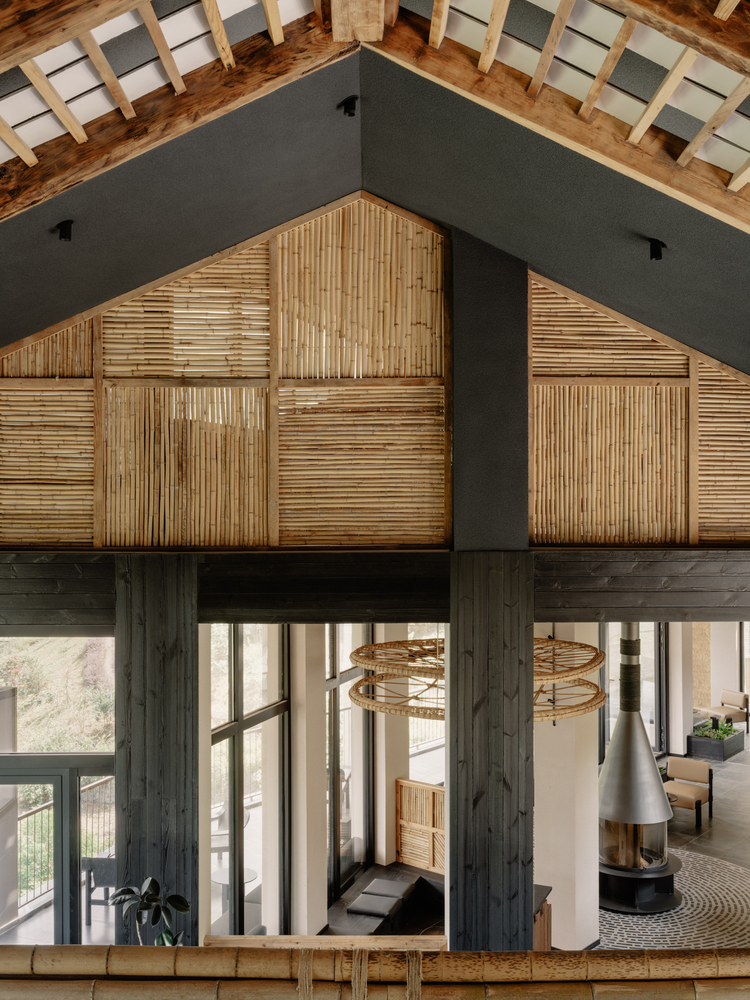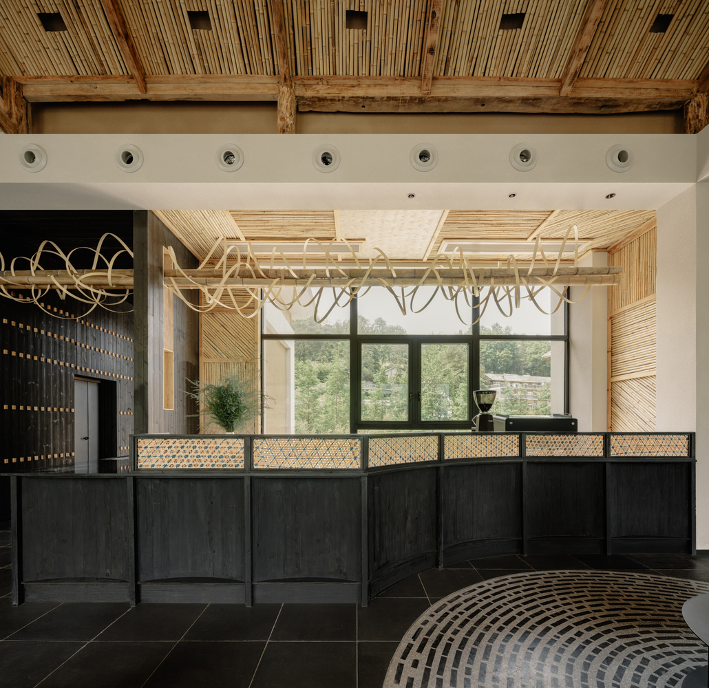 Interior finishes use locally collected bamboo shoot shells, reclaimed timber, carbonized wood, woven bamboo artworks, and black stones to create a tactile, immersive environment crafted in collaboration with local artisans.