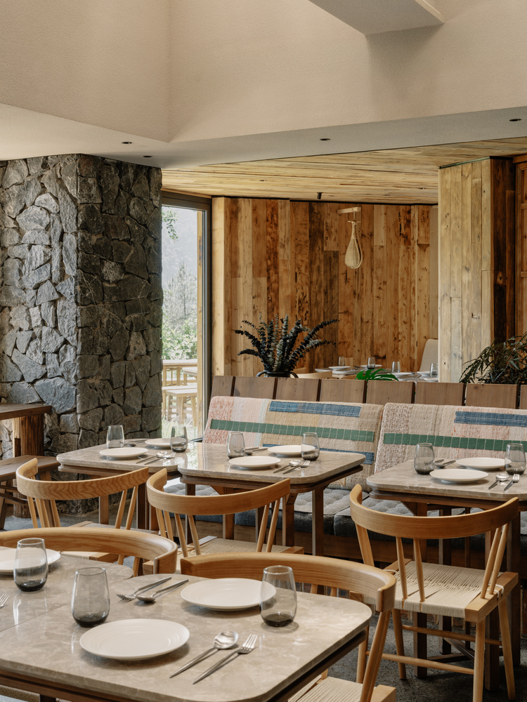 Located in the expanded ground-floor podium, the restaurant transitions gradually from interior dining to outdoor terraces overlooking the forest.
