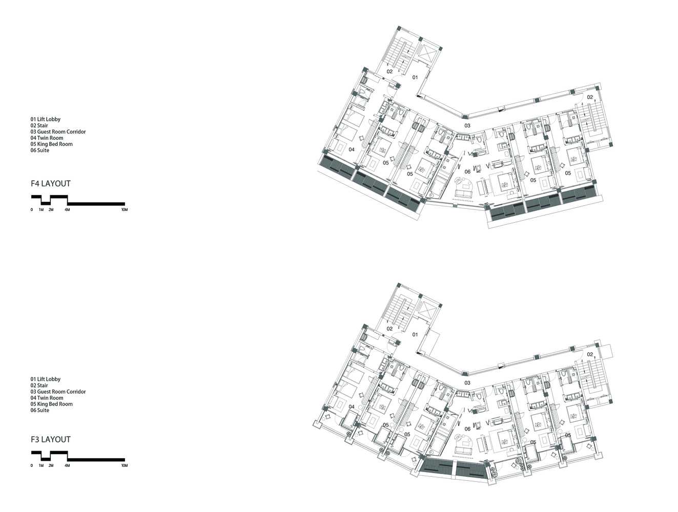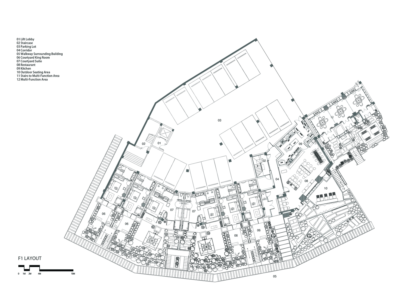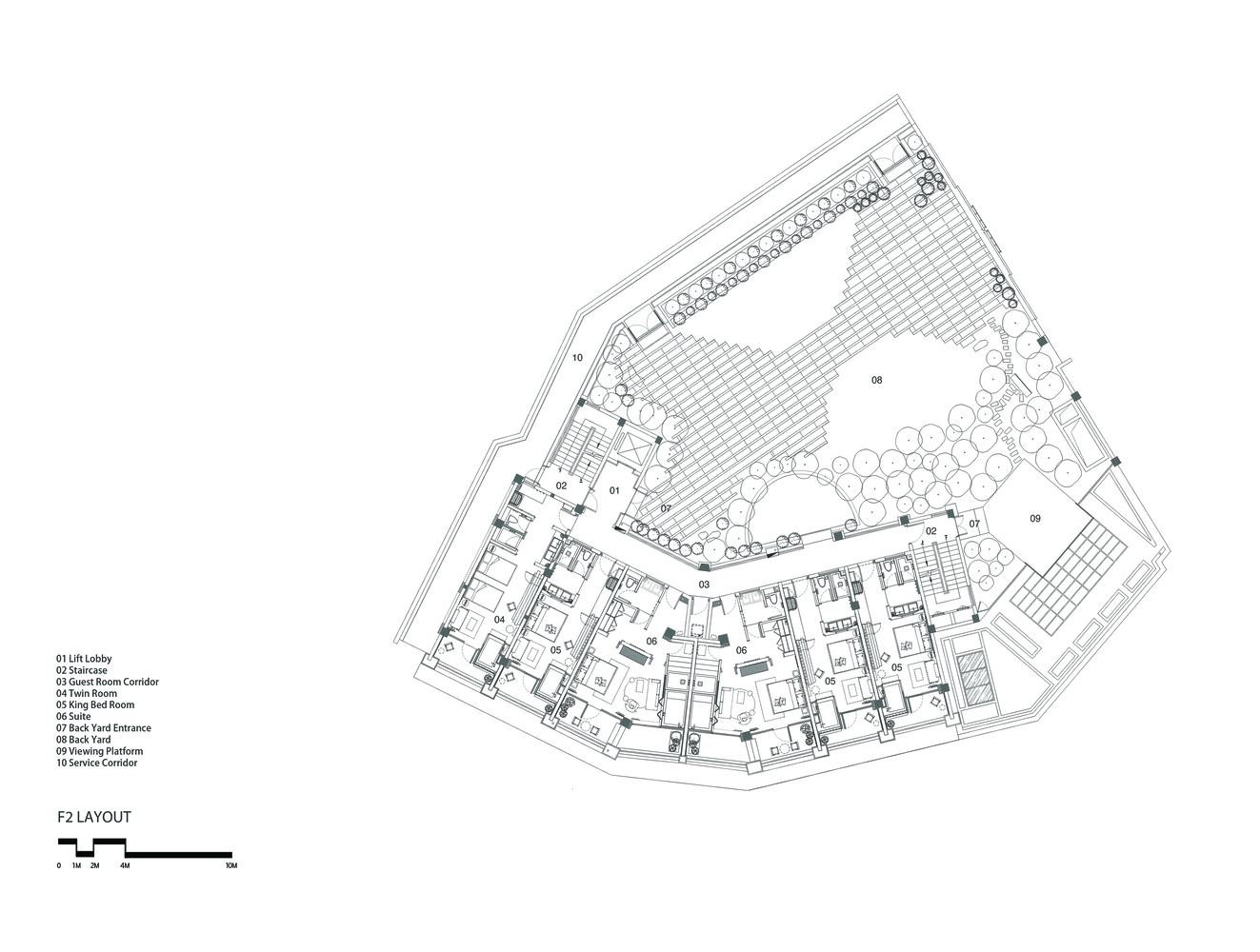 Twenty-five rooms are arranged in a fan-shaped plan oriented toward the mountain, including courtyard suites, high-floor rooms, and standard units.