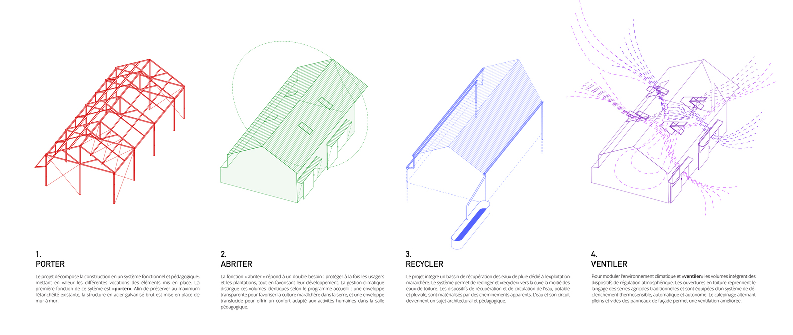 The project is conceived as a functional and pedagogical system articulated around four core principles: support, shelter, recycle, and ventilate.