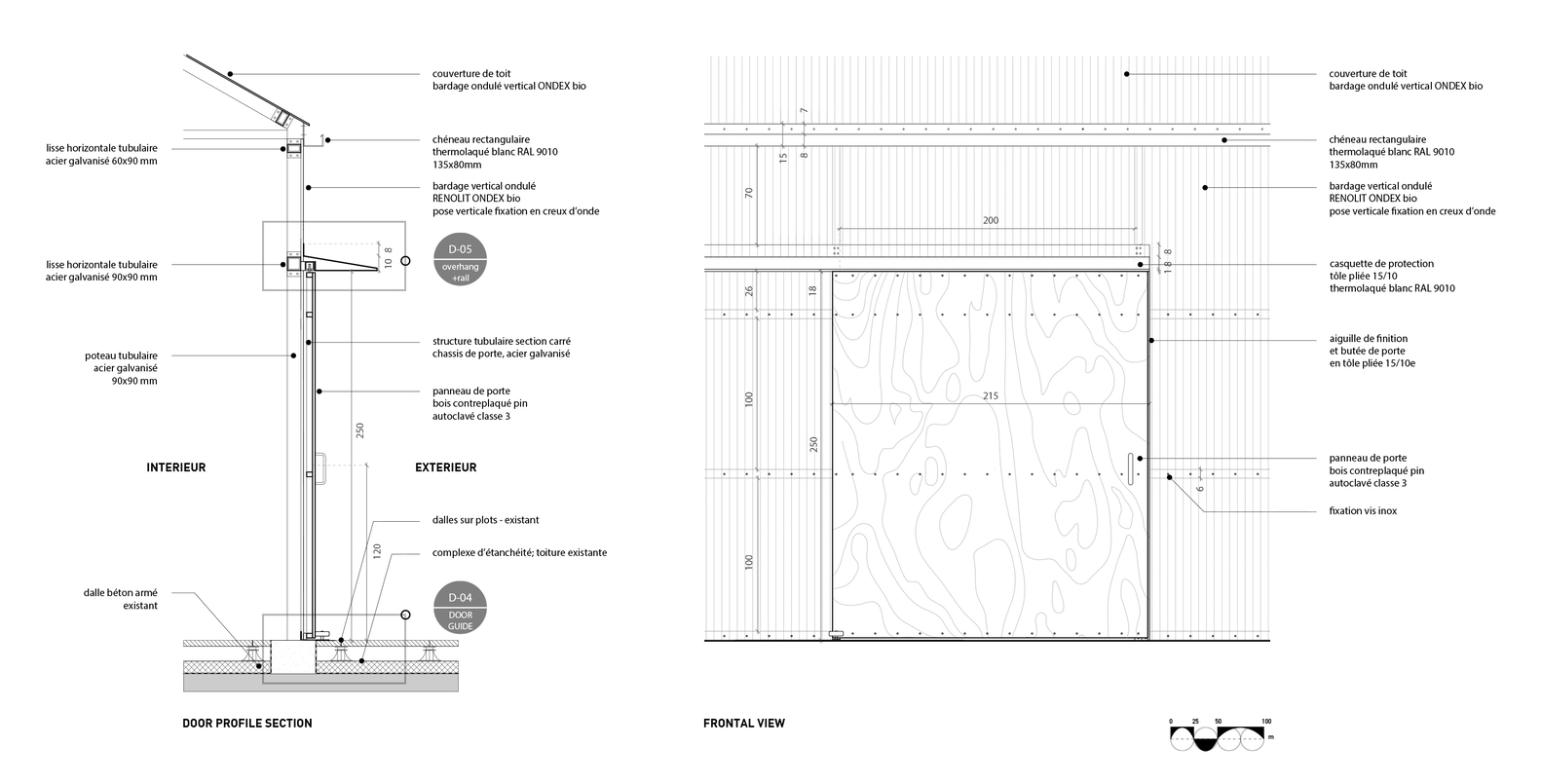 Although the two volumes share a similar structural logic, their climatic envelopes differ according to programmatic use: – A transparent polycarbonate skin maximizes solar gain and supports plant growth in the greenhouse.
