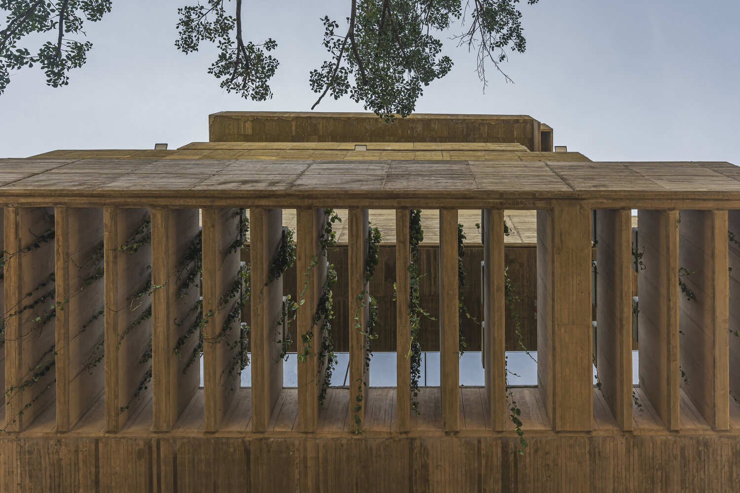 Structurally, it is supported by two rigid cores located at the ends, which frees up the central space and allows for a flexible floor plan for future adaptations. The ochre-pigmented concrete used in the main body references the region's earthen walls, while the cores and columns contrast with a conventional gray concrete finish.