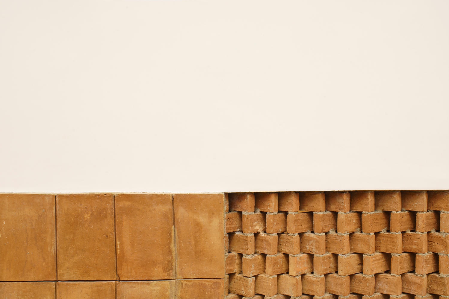 The base of the wall is clad with ceramic tiles originally intended for the oven slabs of the region's flour houses.