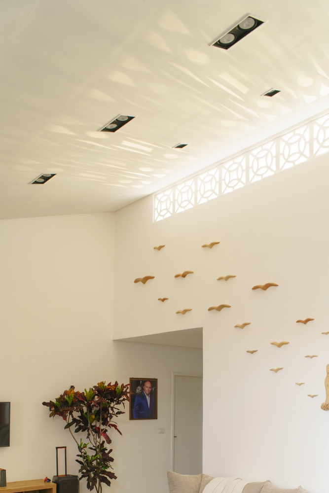 The facade wall, maintained at the resident's request, is now perforated through a pattern of ceramic bricks inspired by how brick factories stack pieces for drying.
