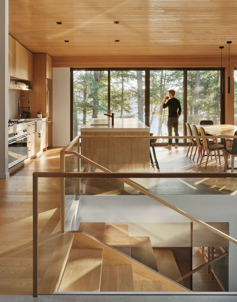 "We designed the cottage with the living spaces upstairs and bedrooms below to preserve the natural contours of the site and ensure accessibility for the entire family," says principal Heather Dubbeldam.