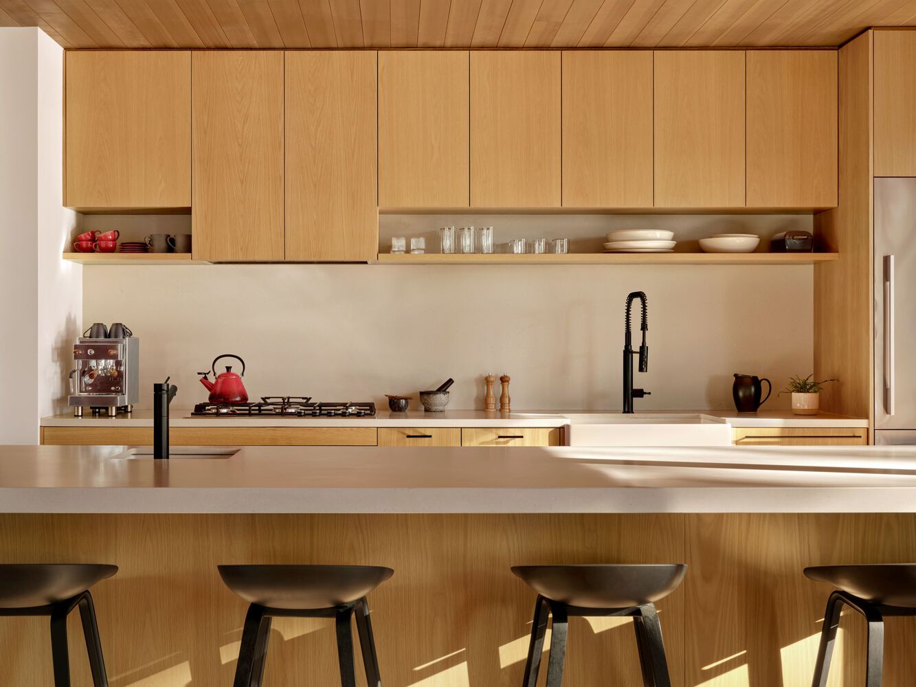 The kitchen features white oak millwork paired with engineered stone counters and backsplash, while a long island with a bar sink and ample seating subtly defines the space.
