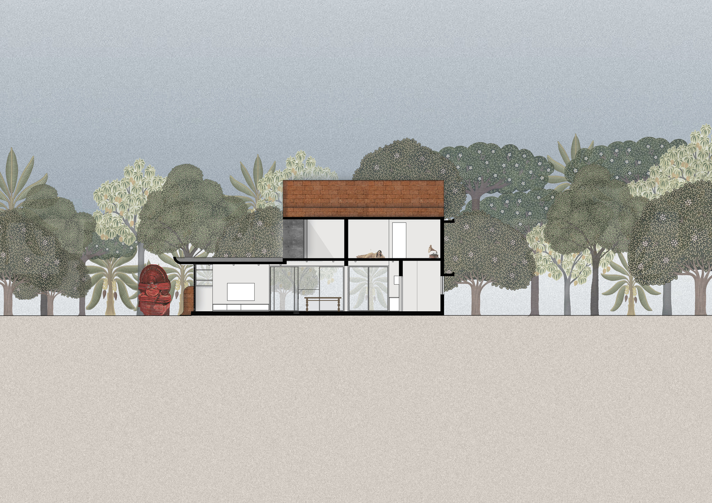 The site being situated in a warm-humid context, desires large overhangs that protect it from both the harsh sun and rain during the monsoon.