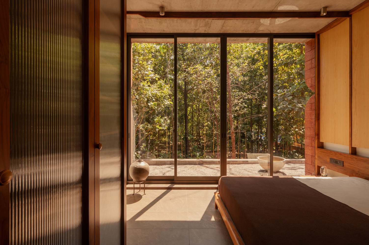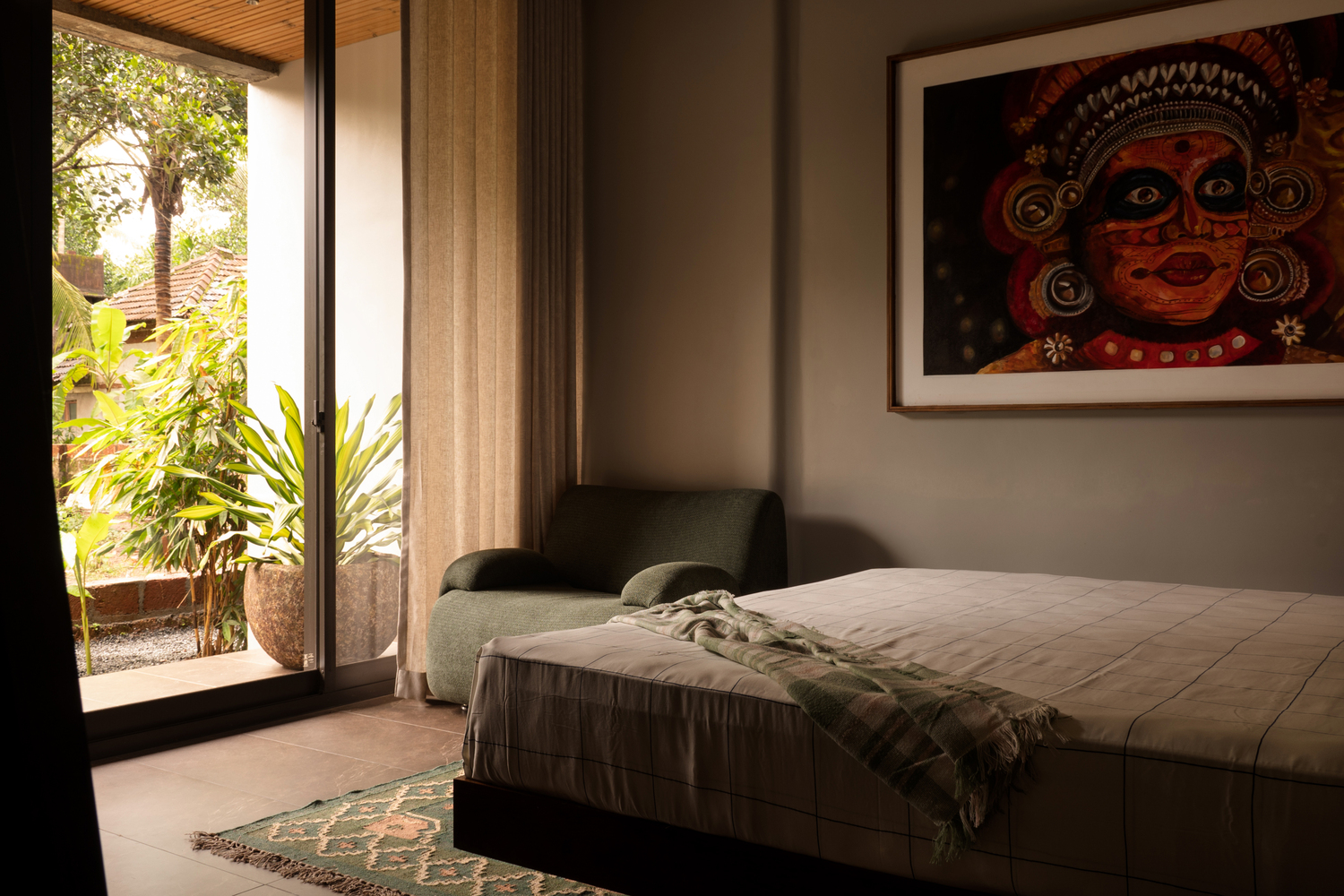 The bedrooms are minimal yet have their defined identity, be it the folded veneer panels above the headboard, or the theyyam painting that vibrantly stands out in the room; it fully realizes the intention- staying true to the concept throughout.