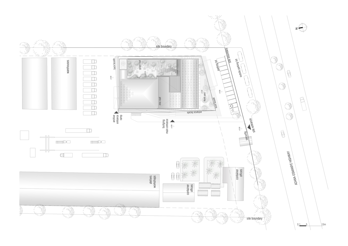 By creating a green courtyard in the inner building, which includes archive, office, and exhibition areas, a green transition and air circulation were provided between all spaces.