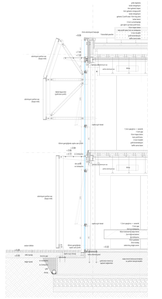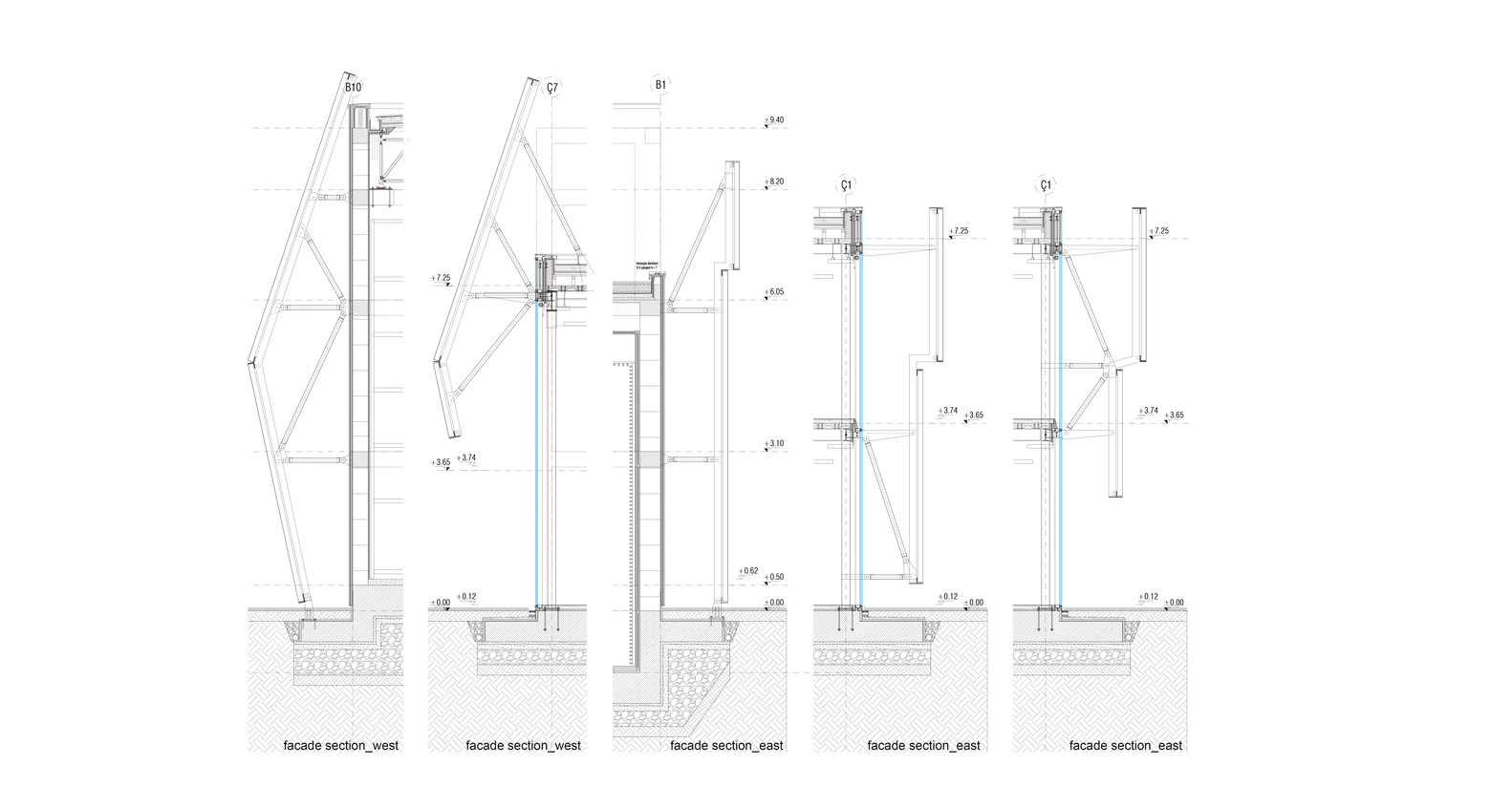 While the archive room was designed as a self-enclosed area as a program, it was built as reinforced concrete structurally. On the other hand, offices are designed to show the steel structure completely inside the building, supported by transparent glass facades. At the intersection of this fully closed and fully open program, the museum is placed as the foyer and meeting point of two different programs.