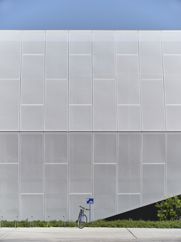 The multi-purpose metal perforated shell that completely surrounds the building is aimed to create inner gardens and green areas by changing the distances between the interior building.