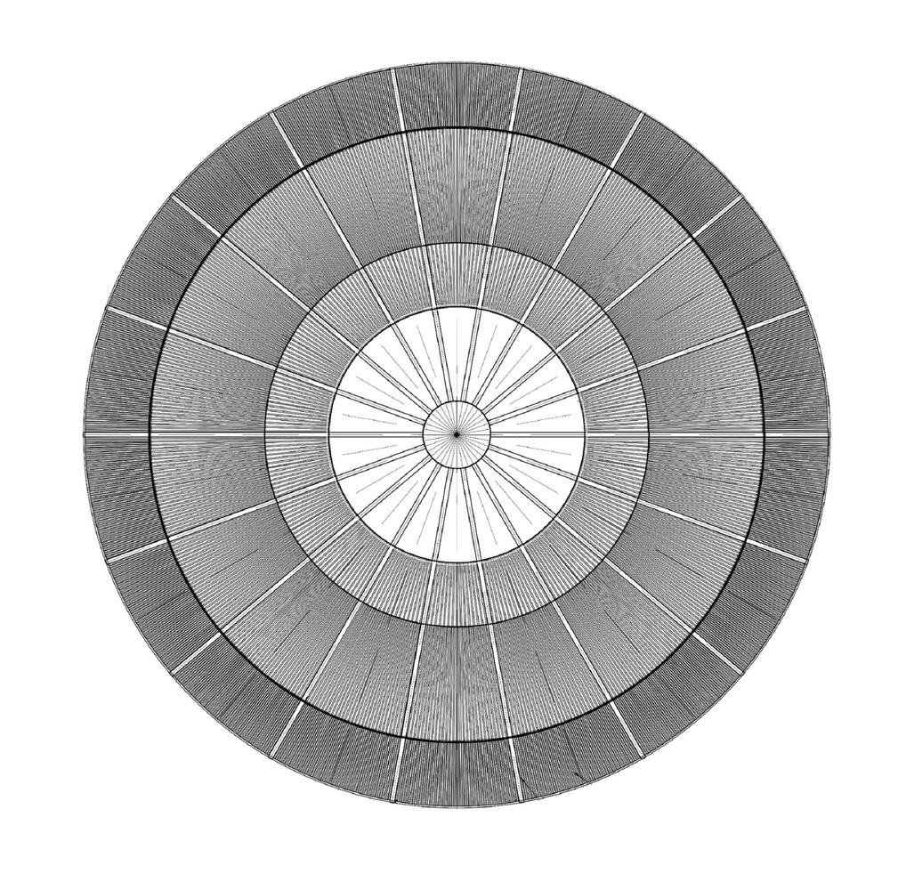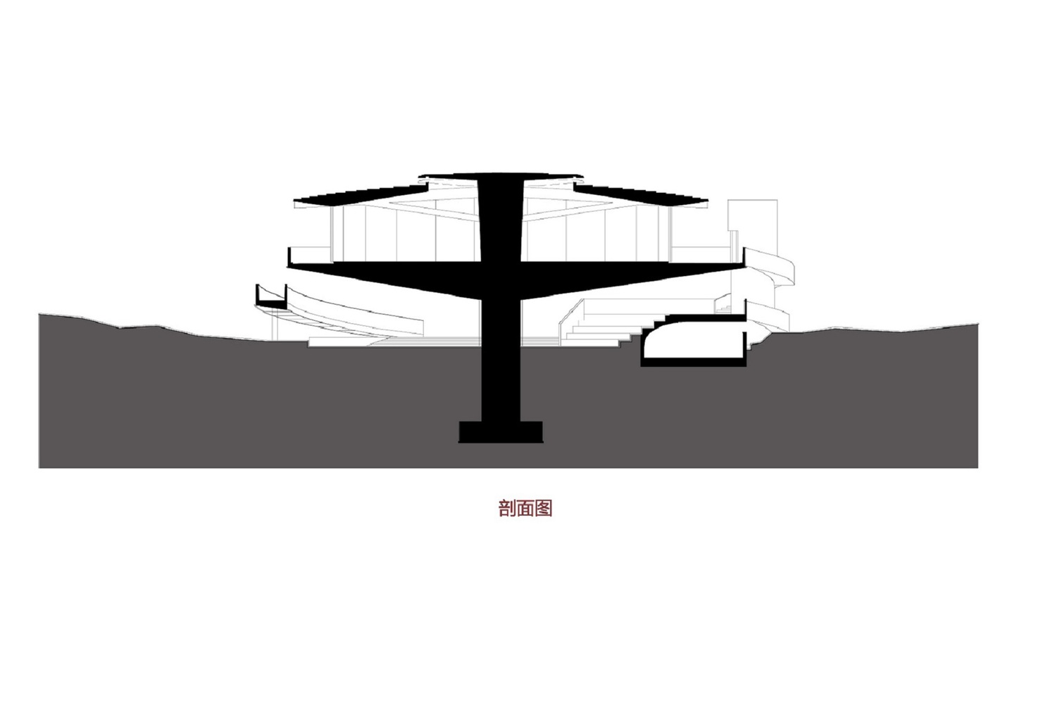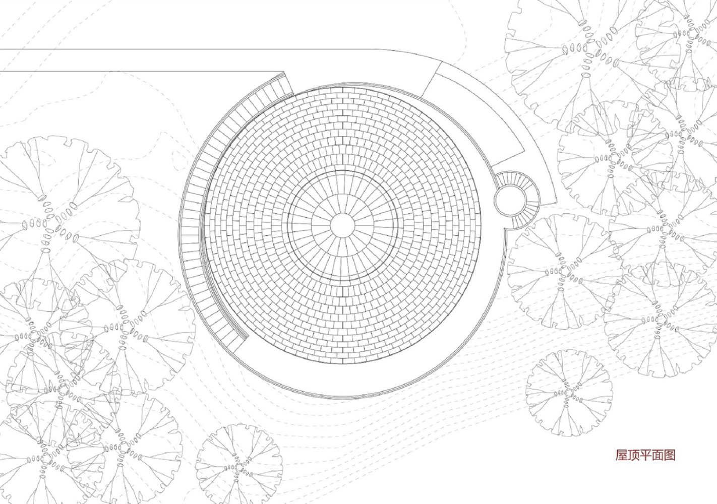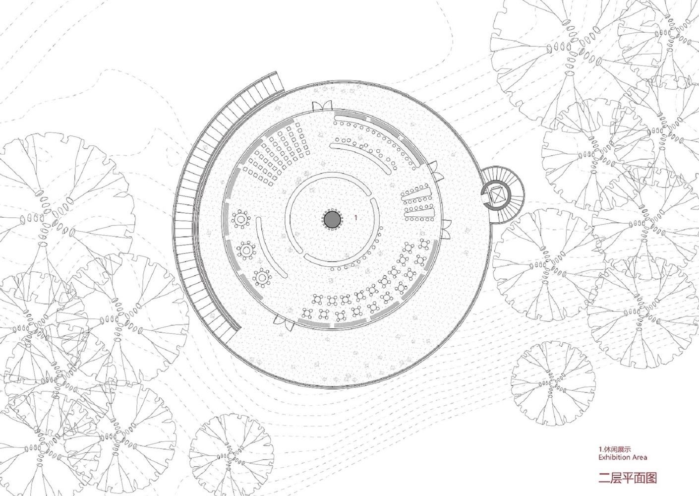 The non-accessible roof is supported by a central column within a 16-meter radius umbrella structure. The main activity platform on the second level, which serves as the primary circulation space, forms a circular plane with a 19-meter radius.