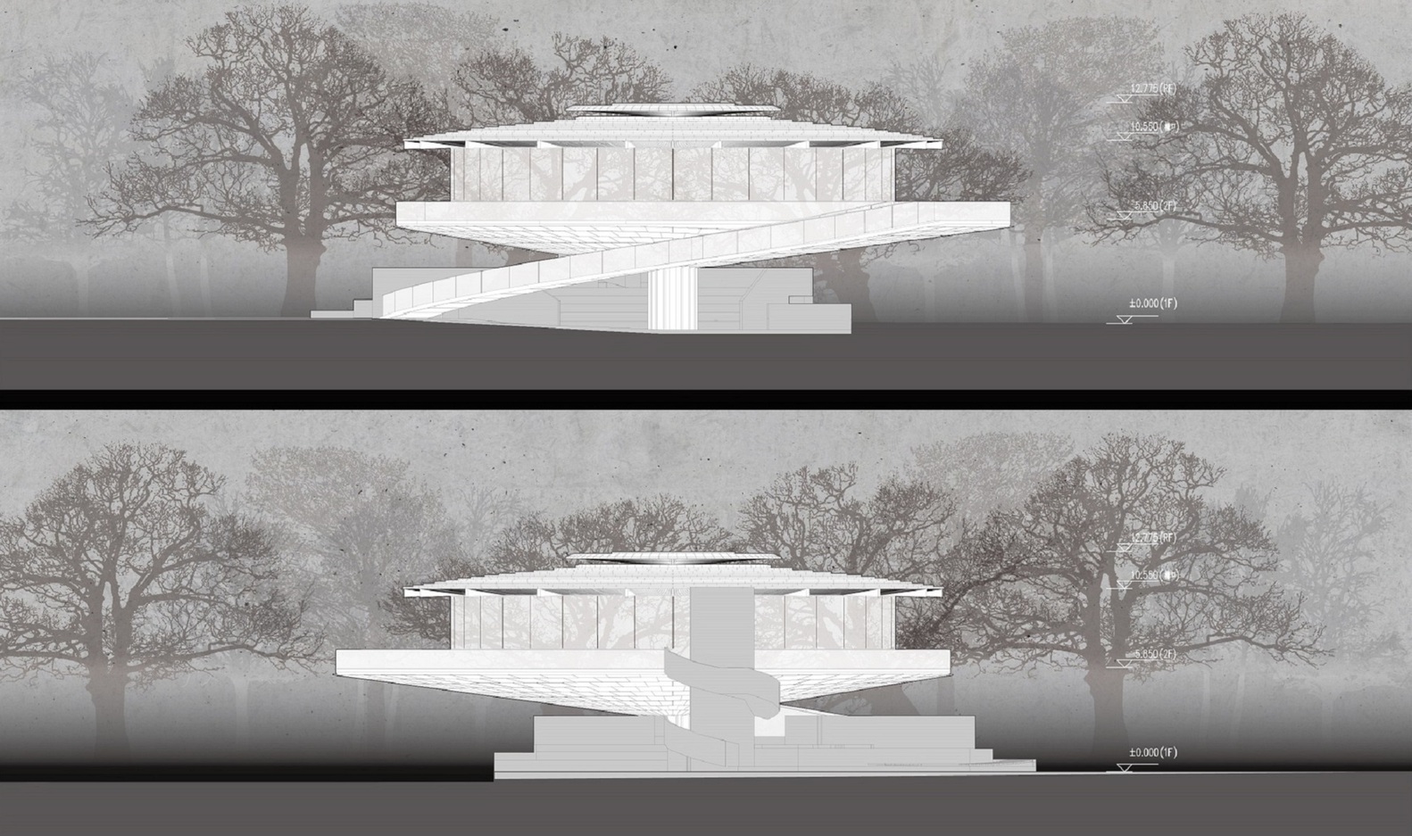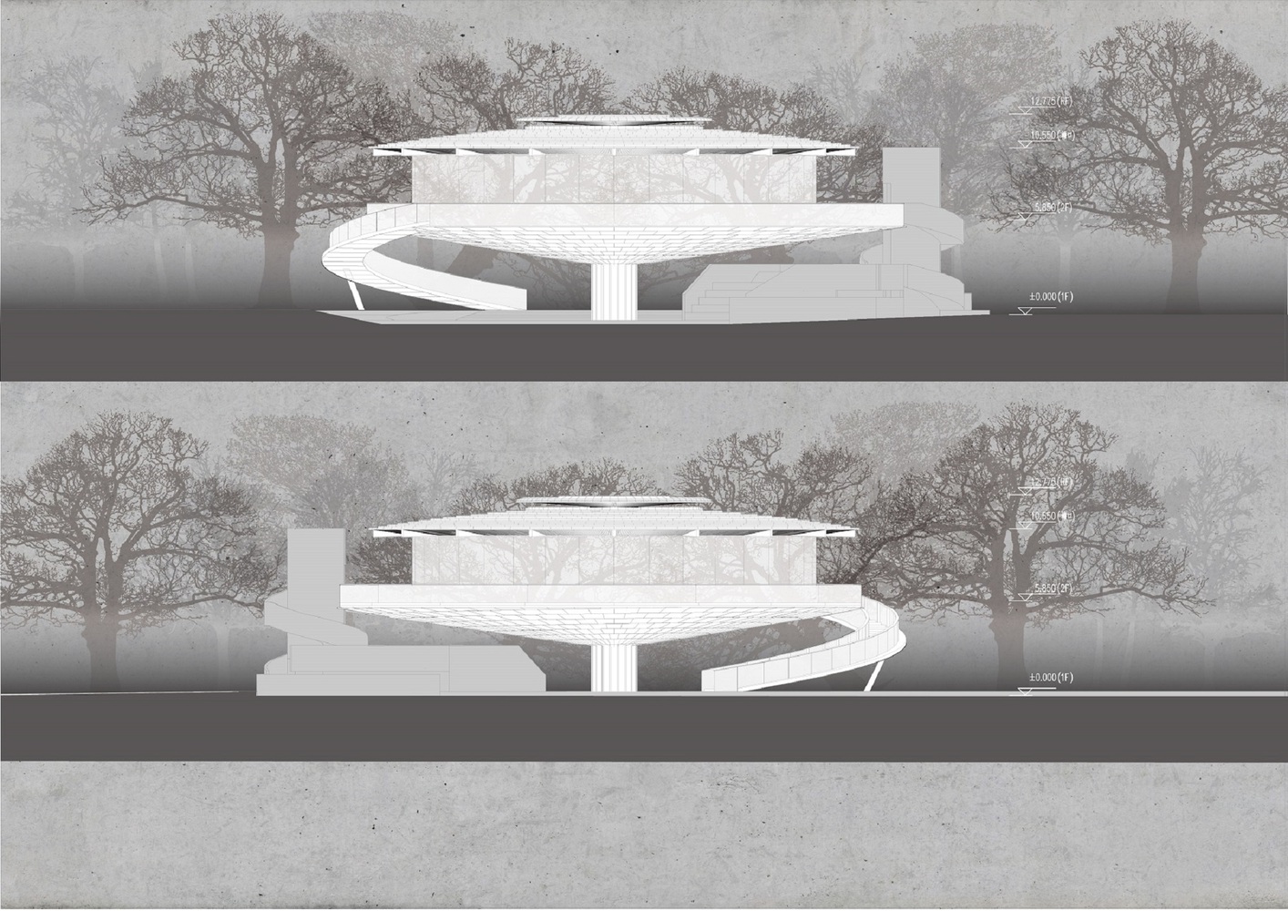 To achieve the panoramic view, a circular plan was adopted: a circular gathering space at ground level, a circular platform on the second floor, and a circular roof.