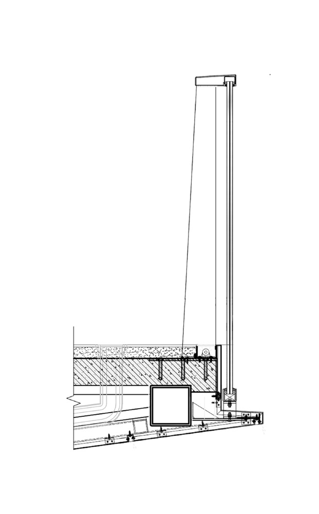 The ceiling for the second-level roof, which must conceal equipment and conduits, features a white gridded drop ceiling aligned with the radial pattern of the main beams, realizing the spatial metaphor of the "dandelion."