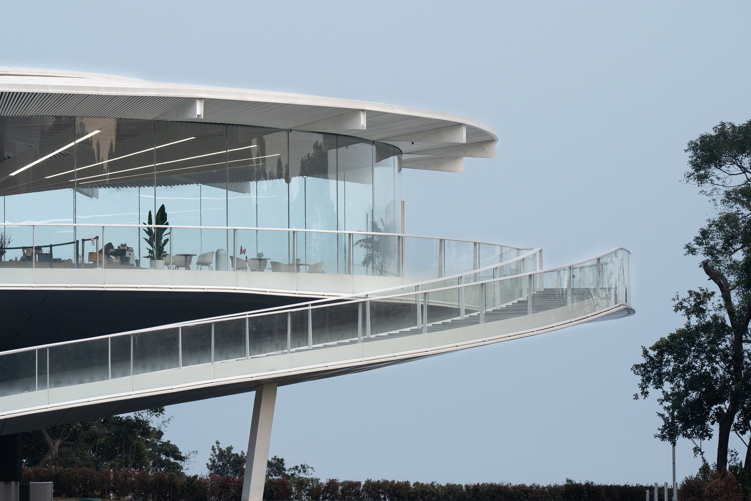 The perimeter glazing employs single-pane curved glass panels that are self-supporting, ensuring unobstructed panoramic views and a sense of transparency from the interior.
