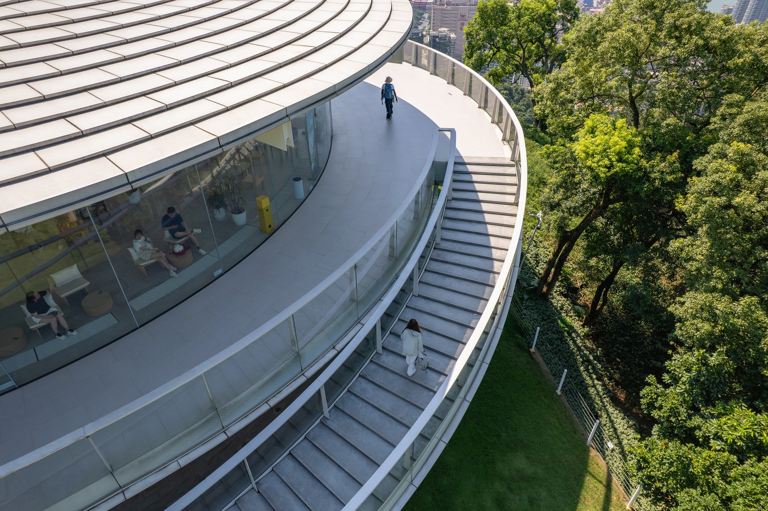 This arrangement allows the activity area on the second floor to be free of peripheral columns, achieving fully open sightlines and 360° panoramic views.